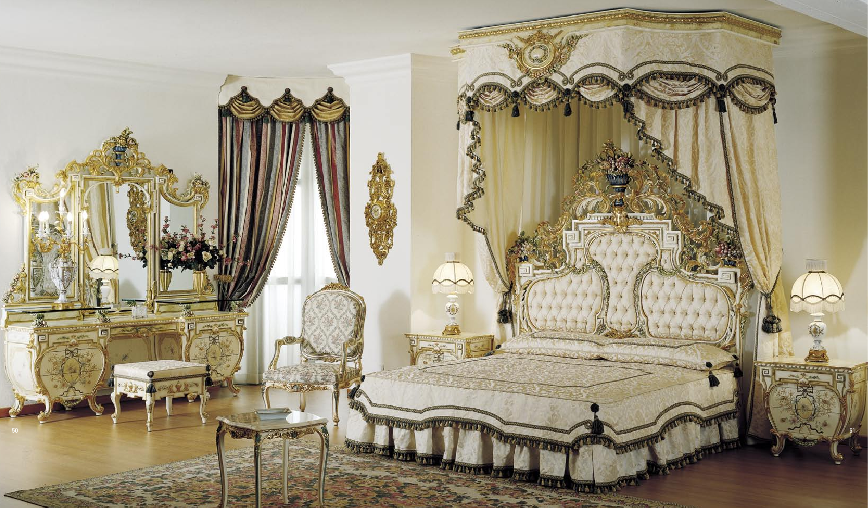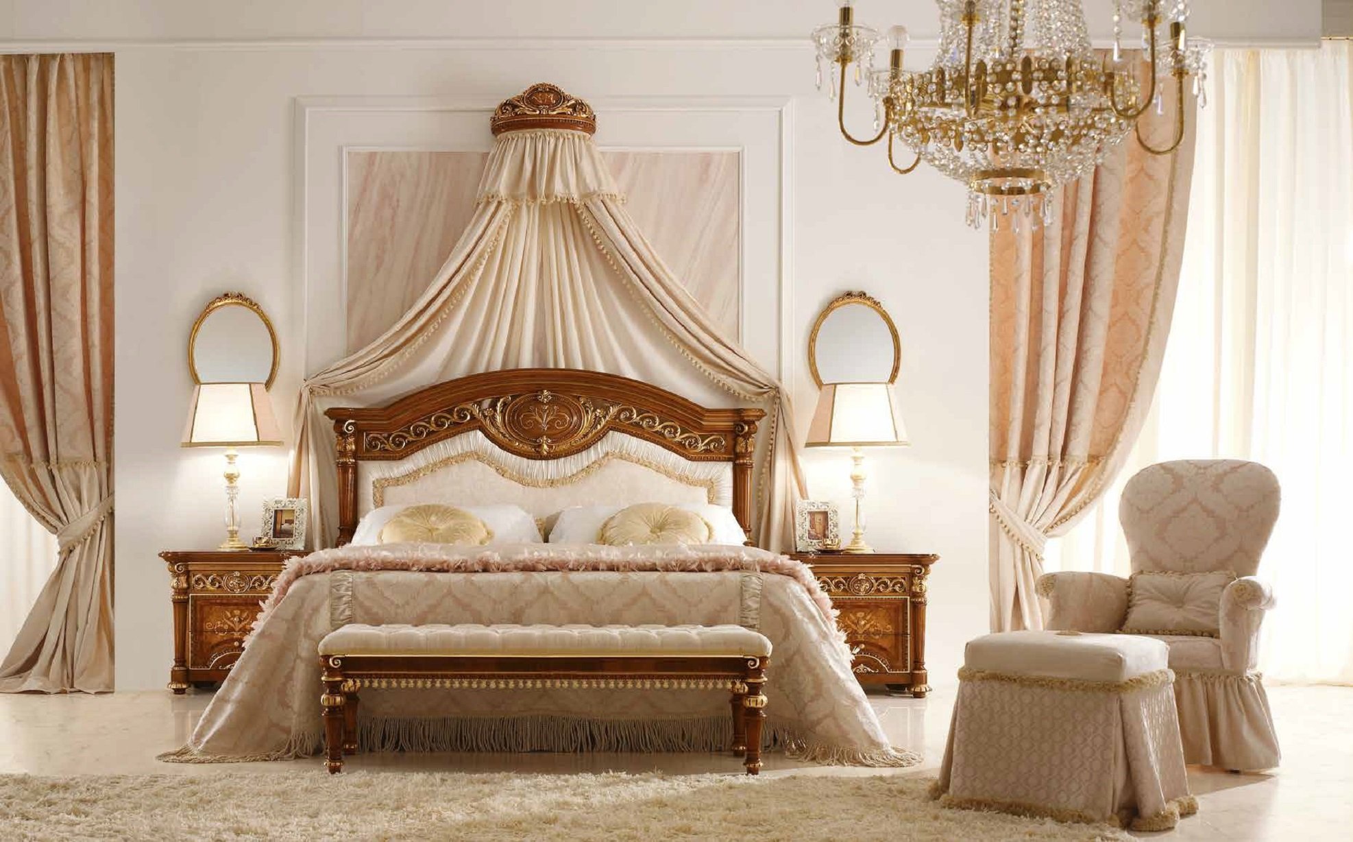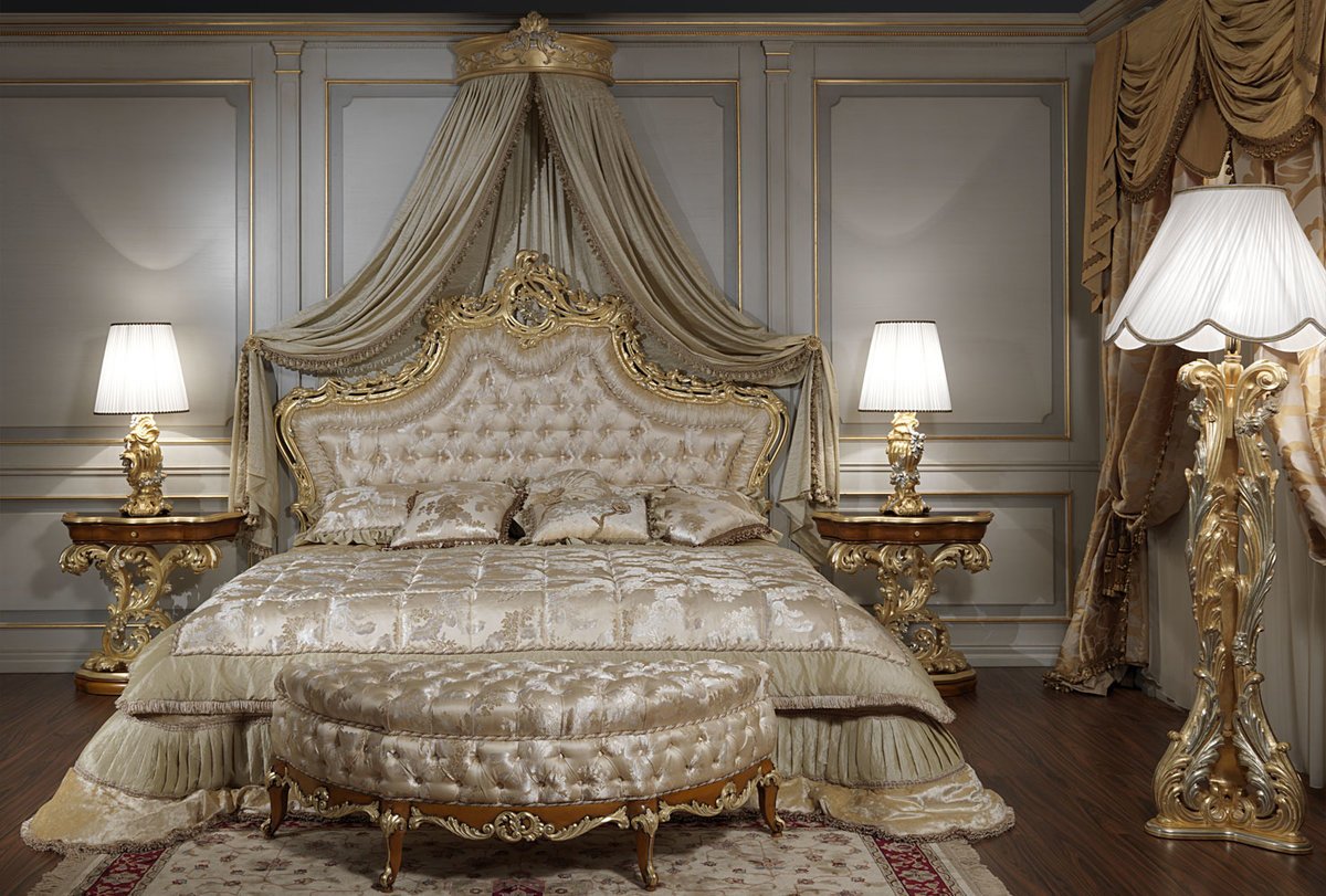 Este Una cama en este estilo debe ser fabulosa, por lo que la capota se elige lo más expresiva y lujosa posible.