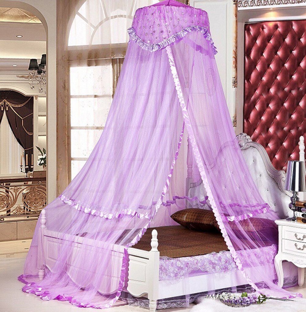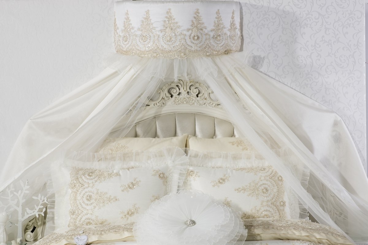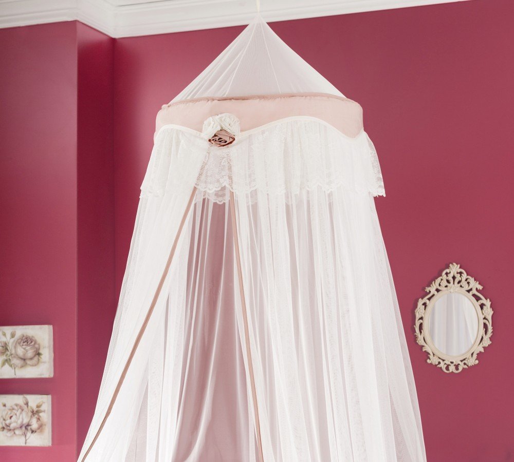 Corona: el llamado diseño pequeño en forma de círculo suspendido en el centro o sobre la cabeza. Se ve muy elegante, aireado y sin peso, y no "come" espacio en absoluto. El tejido está ensartado en un círculo, simple o complementado con una decoración en forma de corona. Cuando está cerrada, la composición parece una tienda de campaña oriental, y el resto del tiempo, los pliegues de la tela caen maravillosamente de ambos lados de la cama.