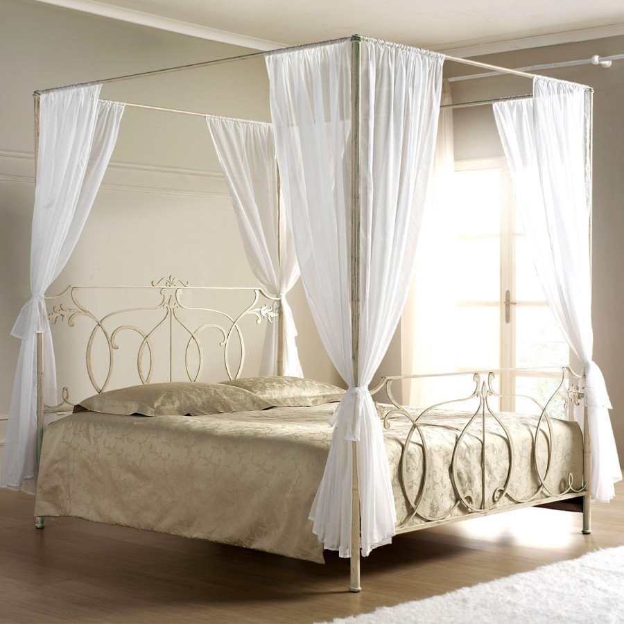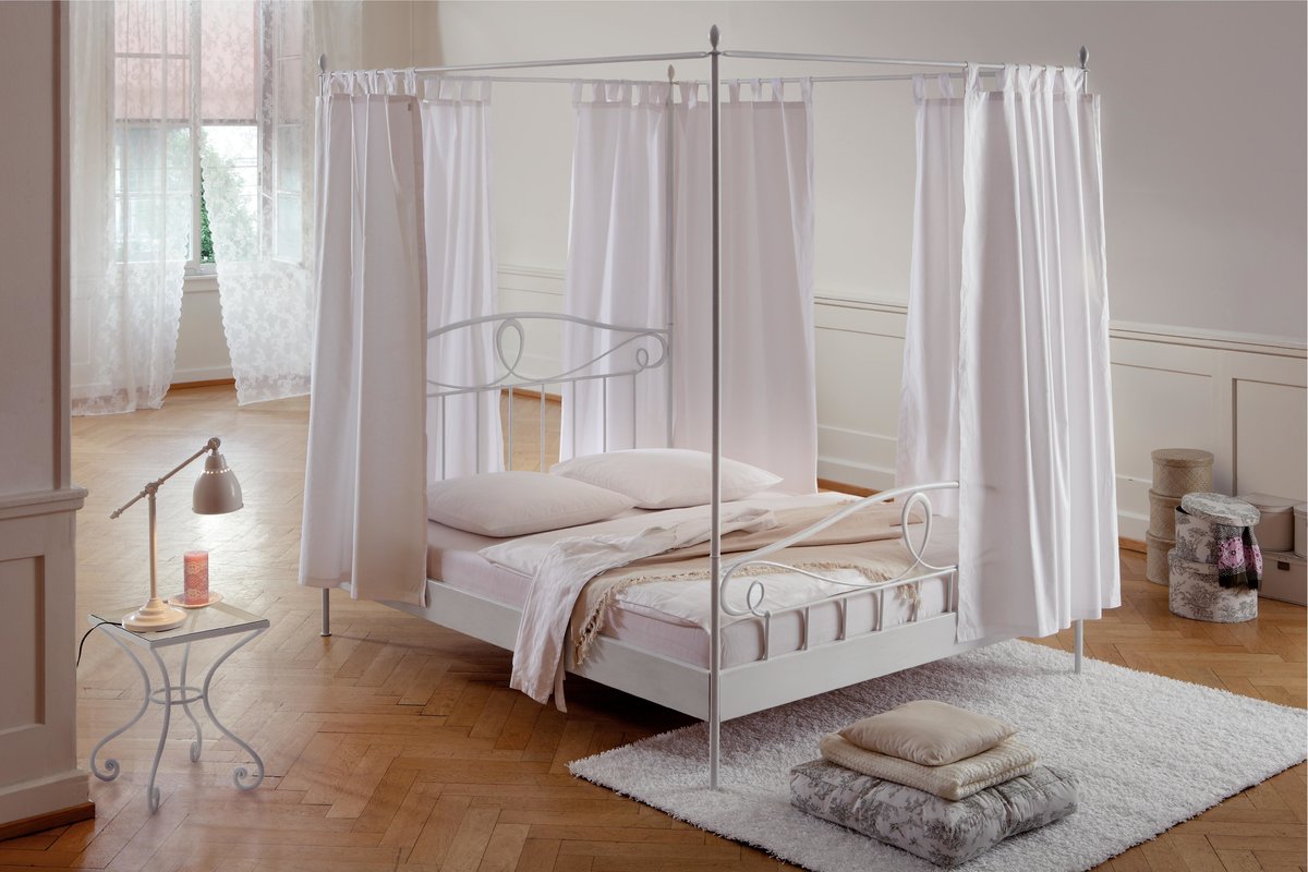 Bastidores: se instalan en las esquinas de la cama. Los elementos tienen puntas talladas en las que se atan las cortinas atadas a un hilo o cuerda de pesca.También hay opciones para bastidores rematados con una cornisa metálica redonda, sobre la cual se estira la tela.