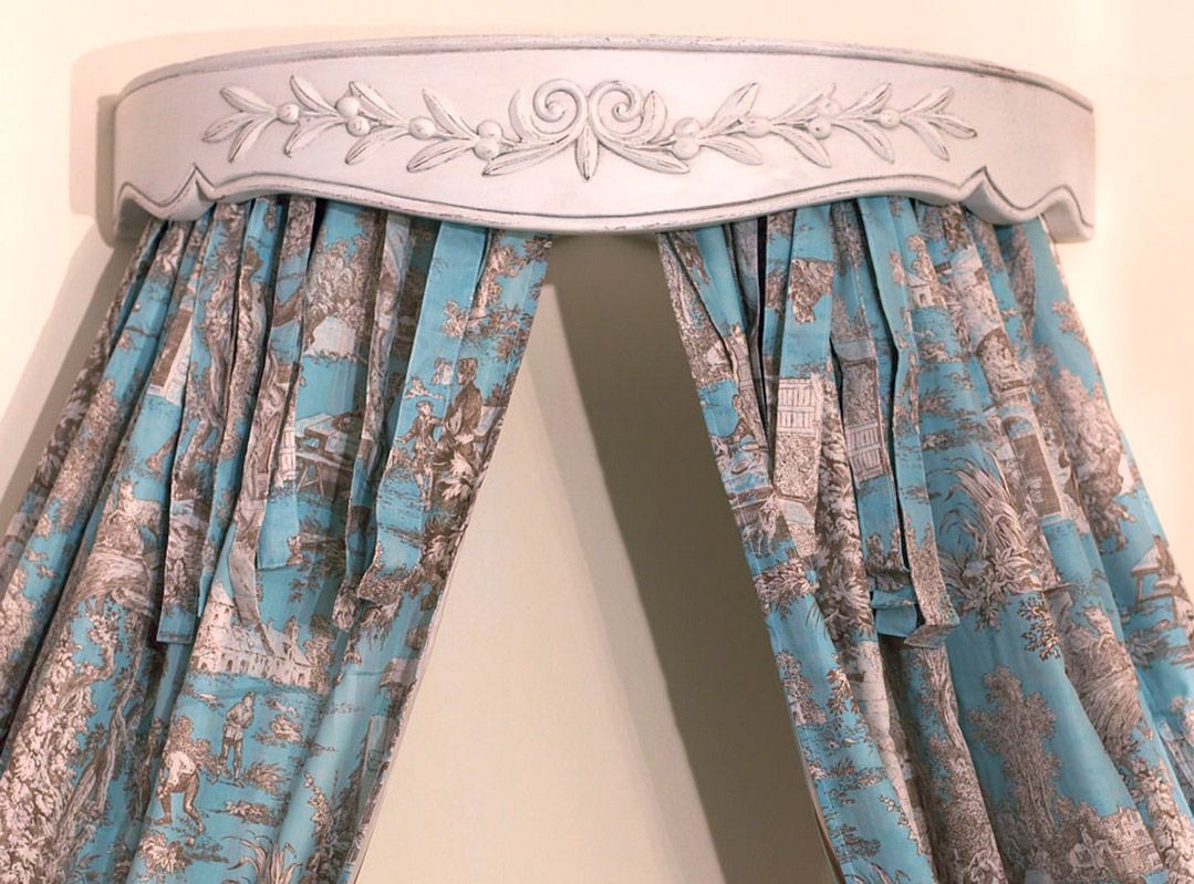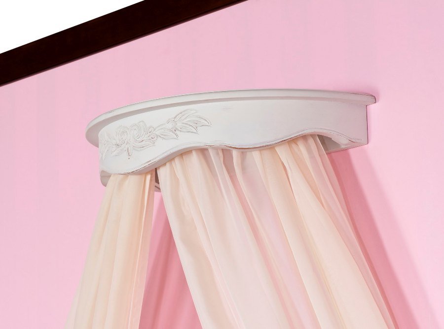 Montaje en la pared: se coloca un arco de metal en la pared sobre la cabeza de la cabeza, o desde el costado, después de lo cual se cuelga un lienzo. Tal diseño no viola y no distrae la atención de un hermoso techo de forma compleja.