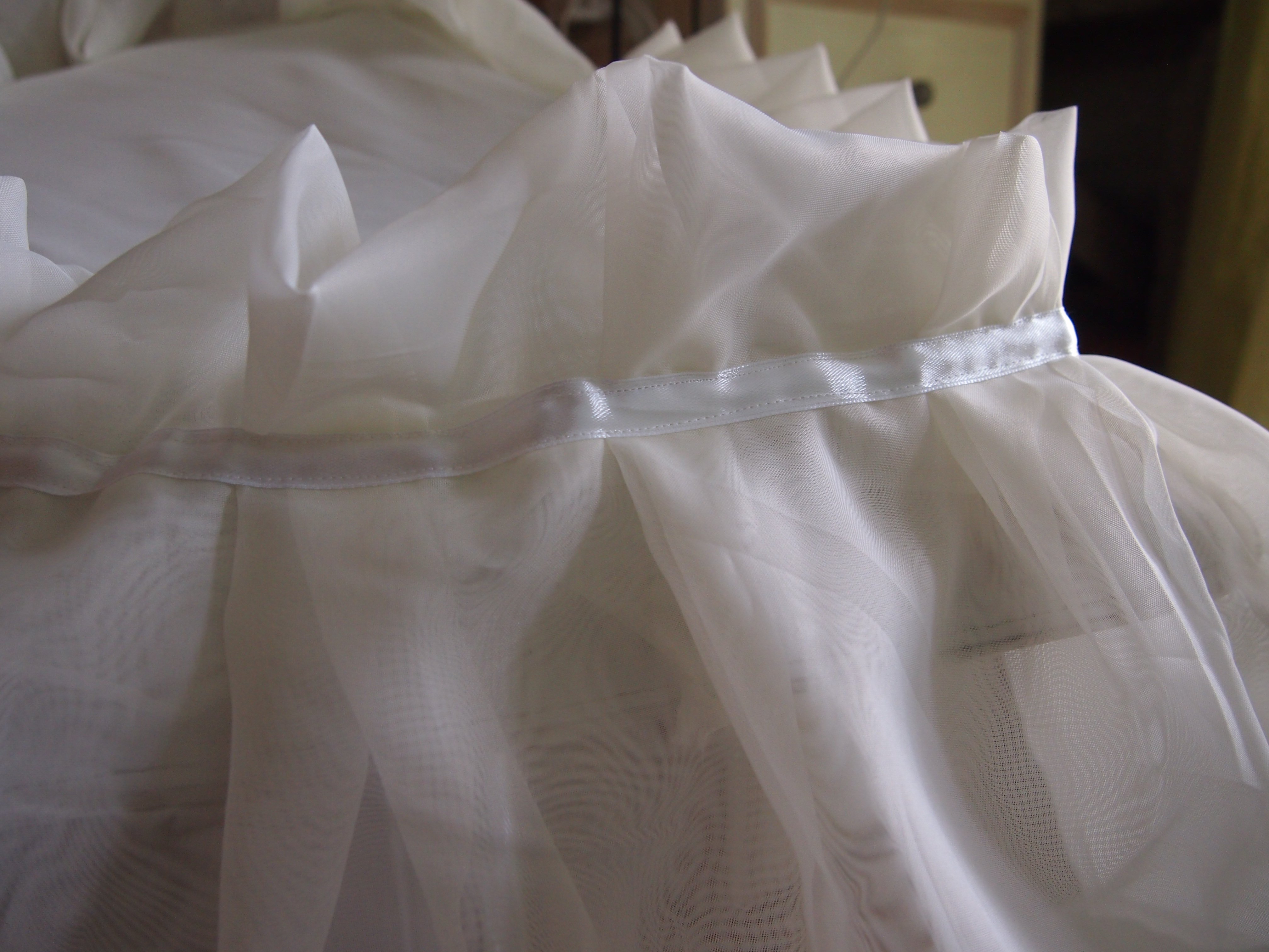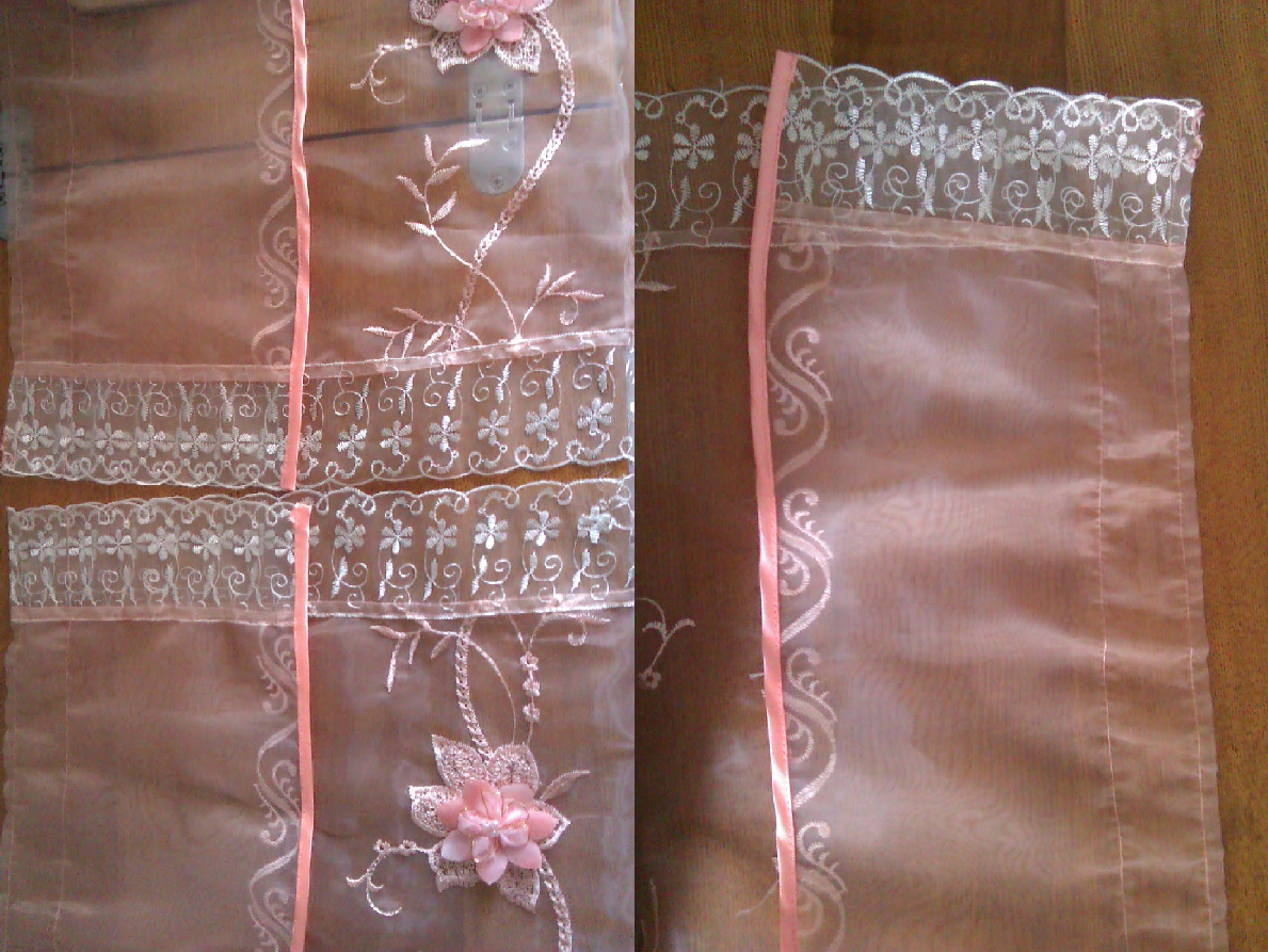 Es necesario medir la cantidad correcta de tela para cada cortina. Habiendo salido de los 30 cm superiores, hacemos una línea y procesamos los bordes. Dibuja dos líneas rectas paralelas al borde. Recolectamos la parte superior para que su longitud sea de 1 m. Cosemos las costuras delineadas y procedemos al procesamiento de la cinta. Lo cosimos a la parte superior del producto resultante, en los lados cosimos volantes de la misma tela o encaje. Después de completar el trabajo, colocamos el producto en un marco redondo y lo enderezamos.
