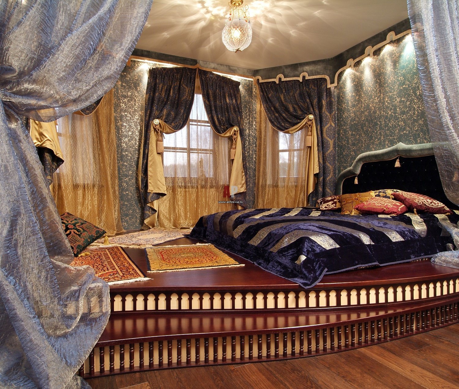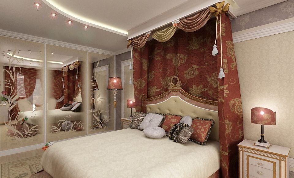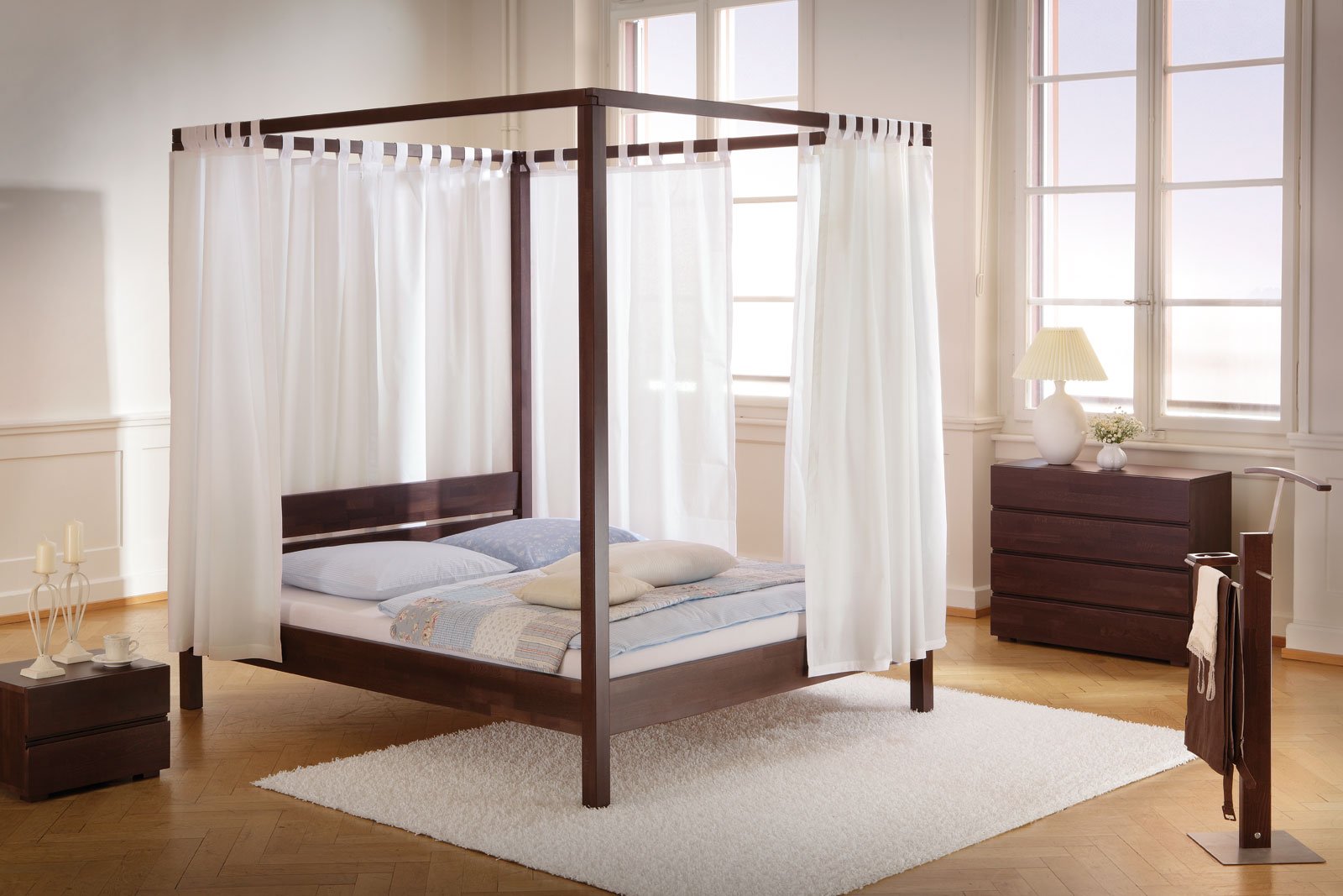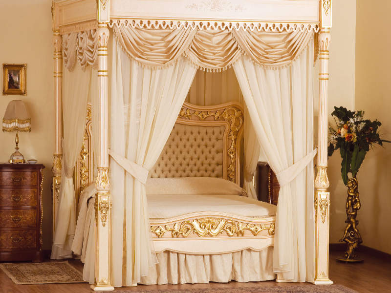Telas pesadas y lujosas: terciopelo, terciopelo, tapiz. Estos son materiales bastante densos y, por lo tanto, retienen bien el calor y bloquean el camino hacia la luz solar.Además, una cortina impenetrable cubre perfectamente la cama de miradas indiscretas y protege la atmósfera privada;