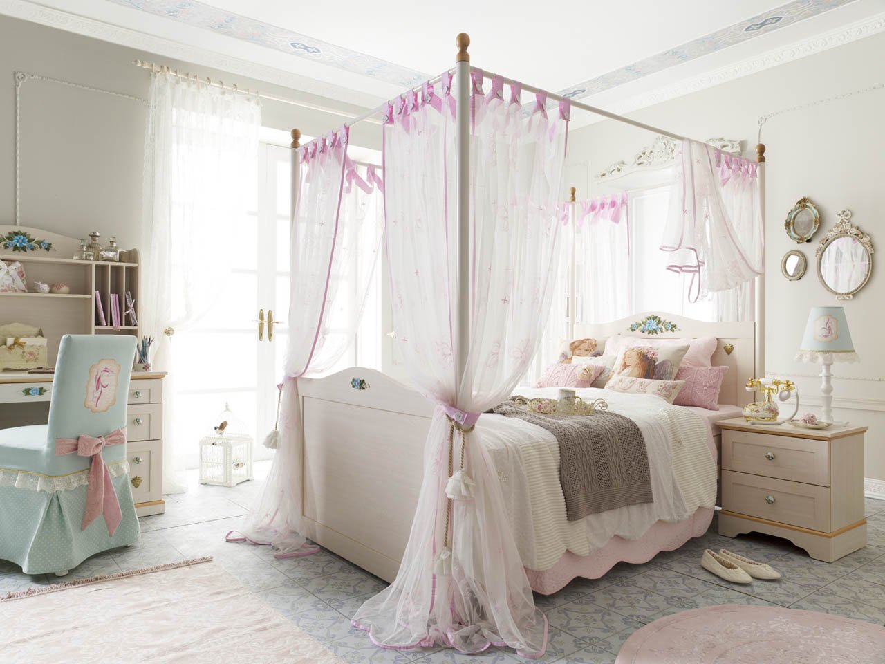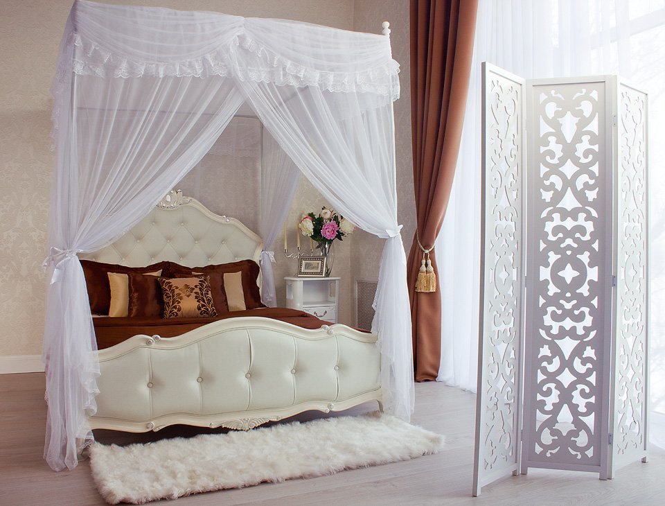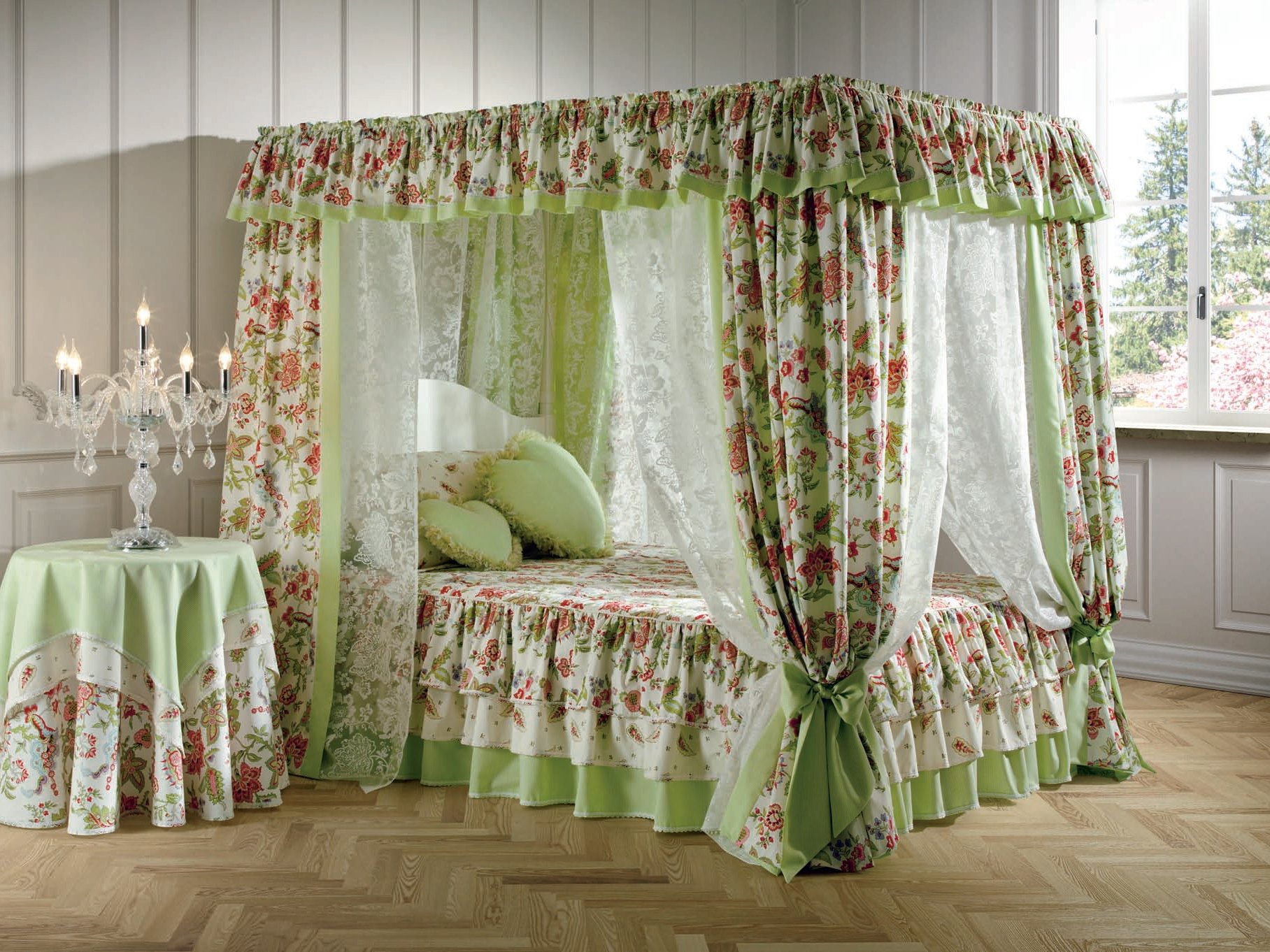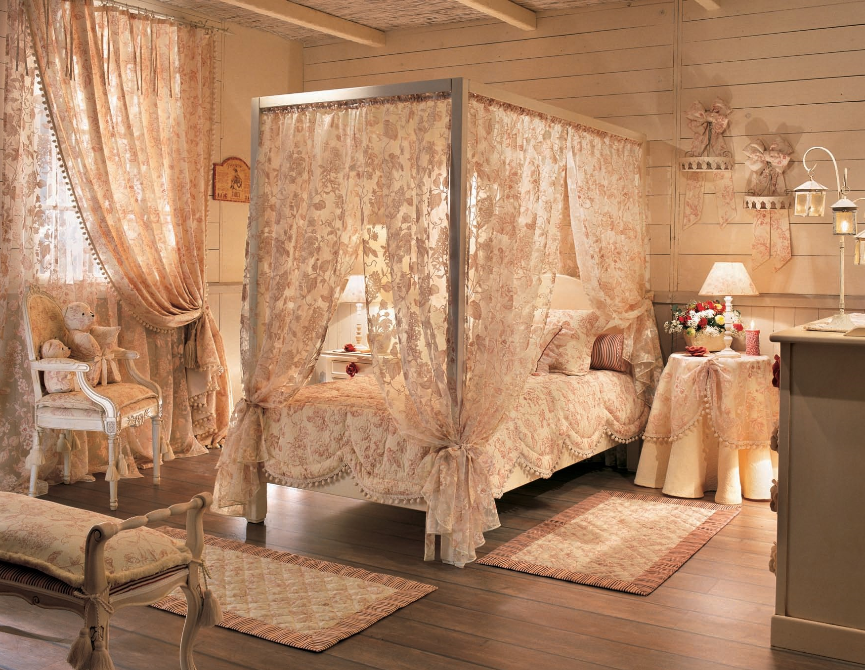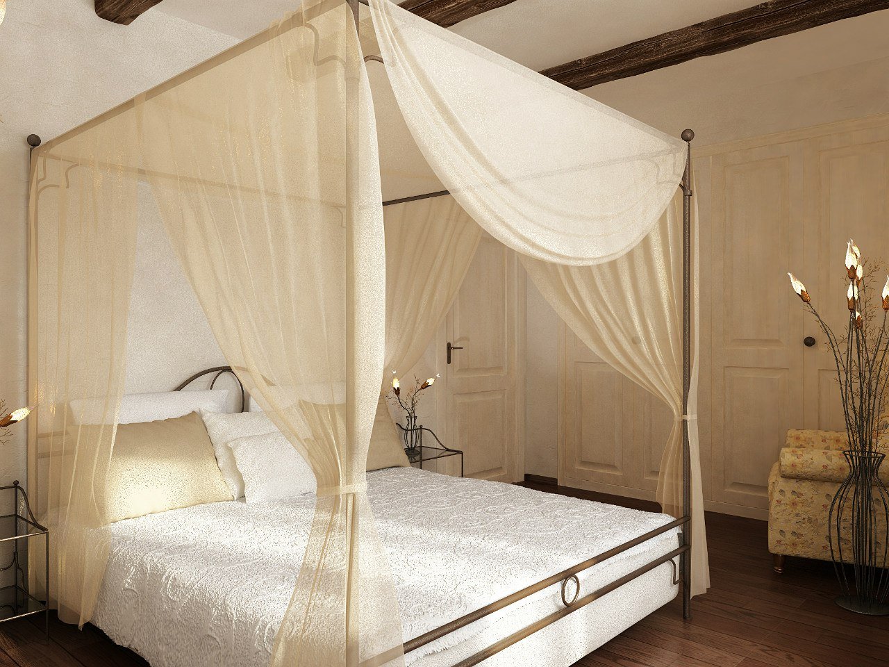 Provenza Un dosel ligero hecho de telas aireadas con una impresión fina se puede decorar con volantes, encaje. En combinación con una cama enorme decorada con tallas patinadas, esto se verá muy romántico.