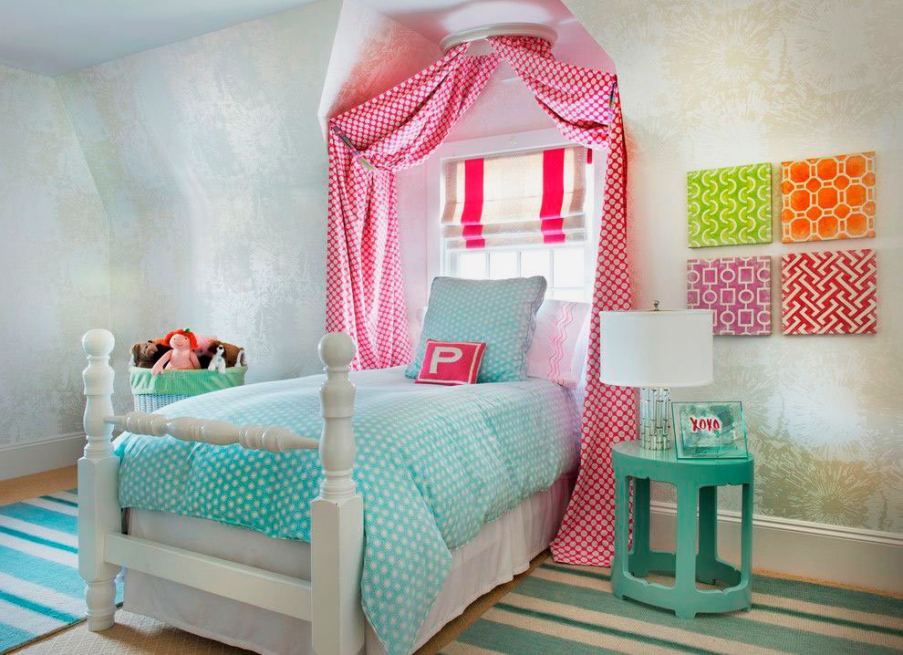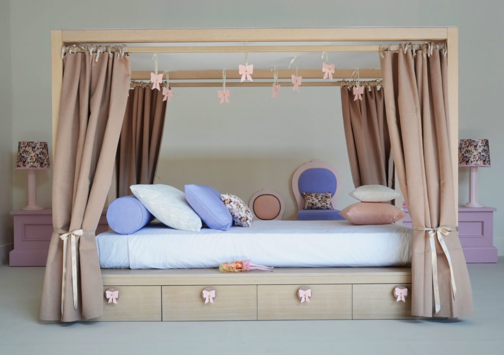 Para un niño adolescente, puede elegir un dosel, fijado alrededor del perímetro. Si la cama es litera, el piso inferior puede cerrarse con cortinas y convertirse en una acogedora casa para juegos. A veces, los fabricantes instalan un sofá debajo, que es muy conveniente para jugar. Elija telas en colores neutros, no irritantes o por género. Para las niñas, los tonos rosados se eligen tradicionalmente, para los niños: azul o azul.