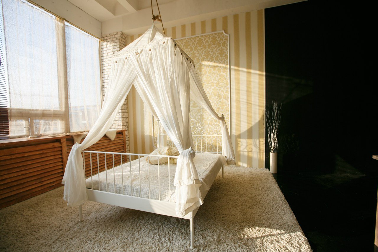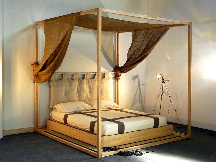 Dosel hecho de aletas colgando de una cama. Al mismo tiempo, no solo se cierra un lugar para dormir, sino que parte de la habitación se convierte en una mini habitación;
