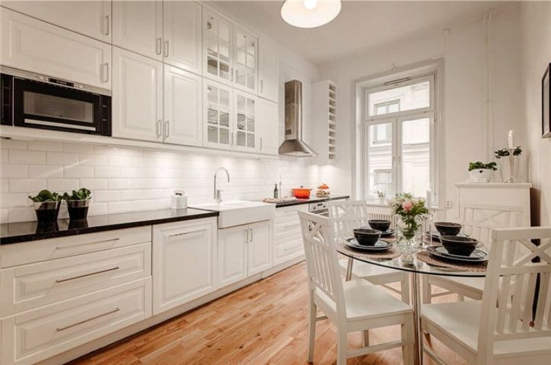 Se ve contrastante e inusual. Ideal para la instalación en habitaciones con un esquema de color blanco-gris. Lo mejor son los productos con una encimera estampada.