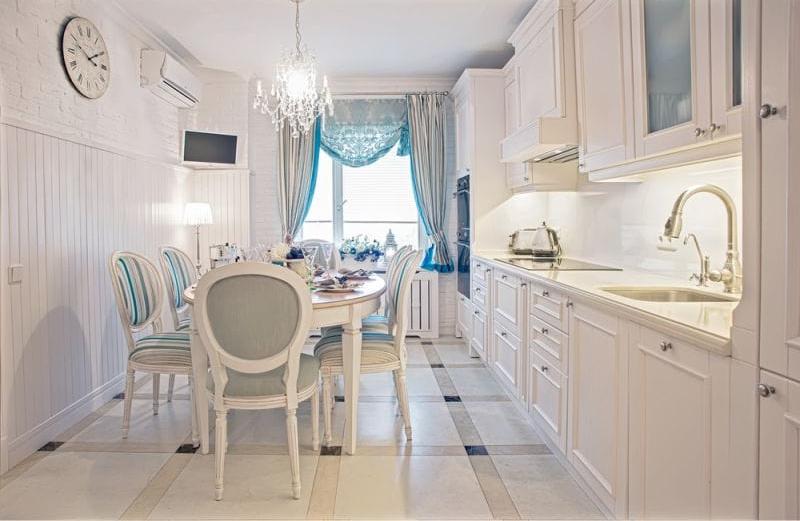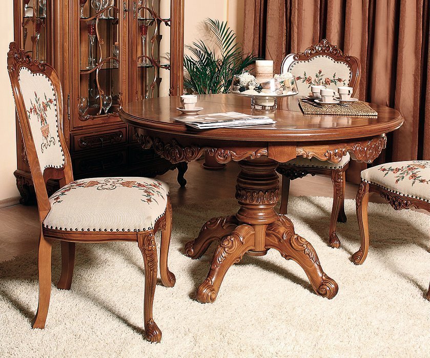 Tal estilo debe complementarse con un producto de madera sobre patas rectas y talladas. Está permitido comprar un modelo clásico en un marco de metal.