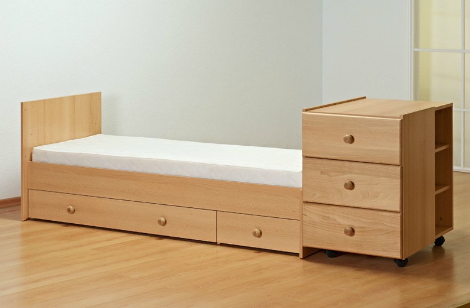 alto, con cajones para cosas, una mesa extraíble que se "esconde" debajo de la superficie de la cama, extendiéndose si es necesario;