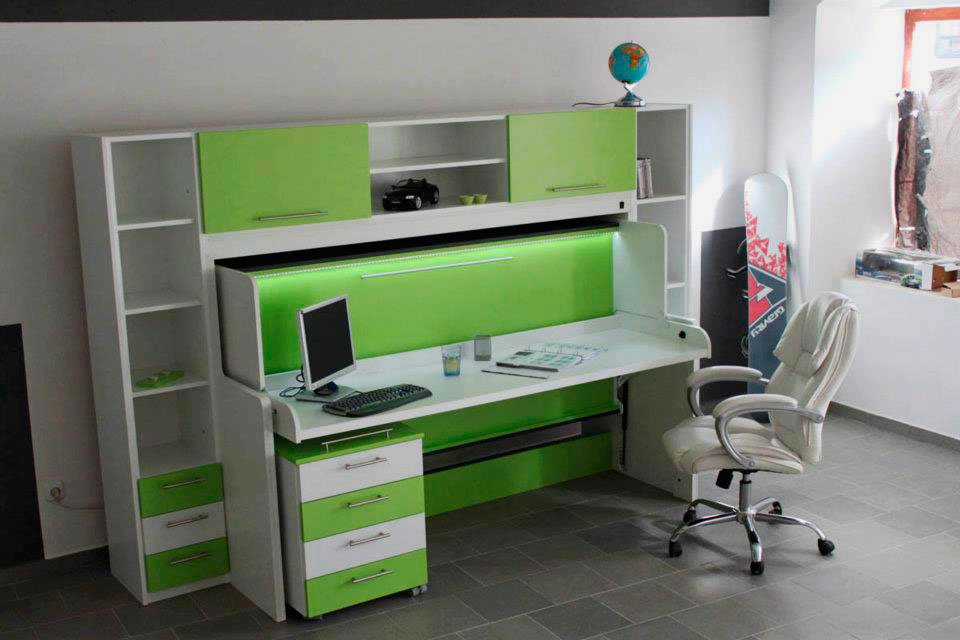 Por lo general, se compra una mesa-cama para organizar un mini estudio en el dormitorio, equipado con una superficie para dormir, así como con equipos para la habitación de los niños. Hay varias opciones para su ejecución: