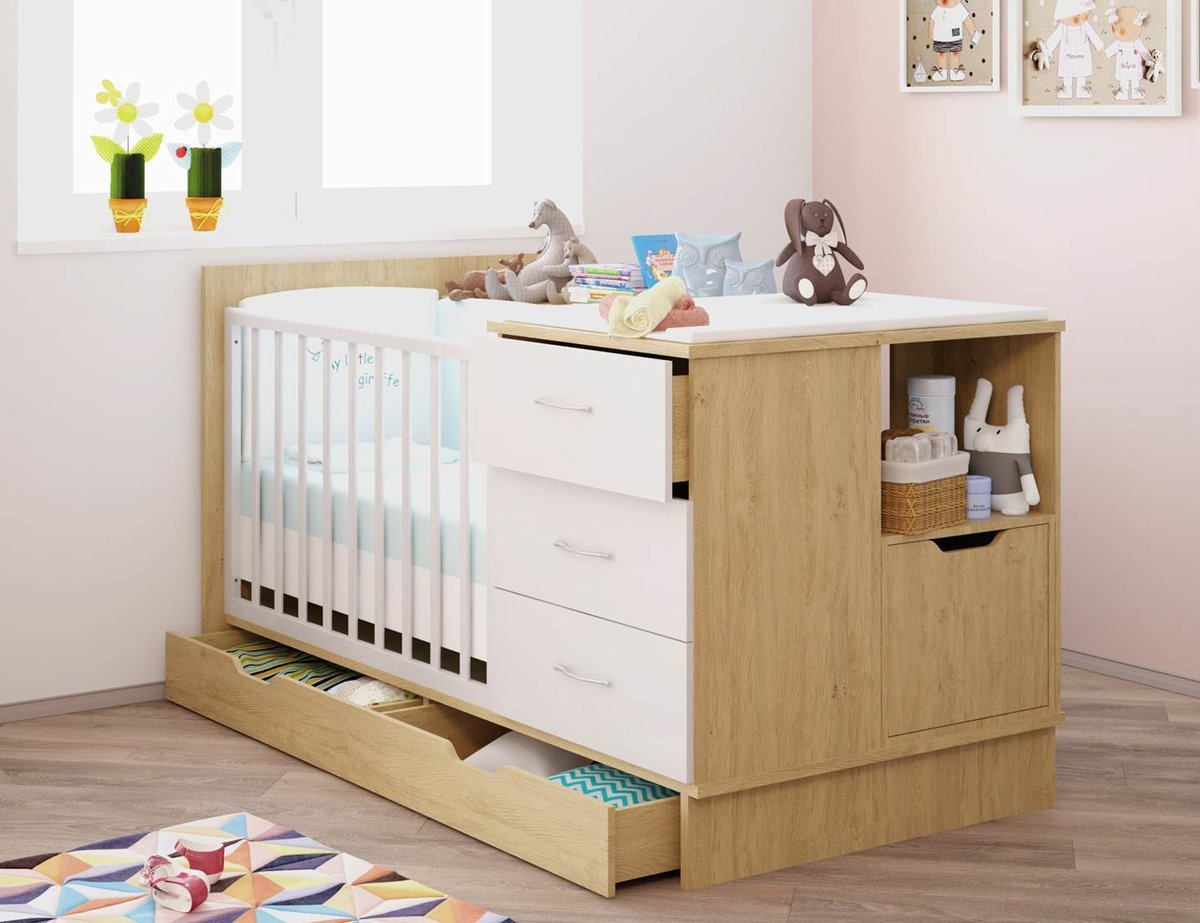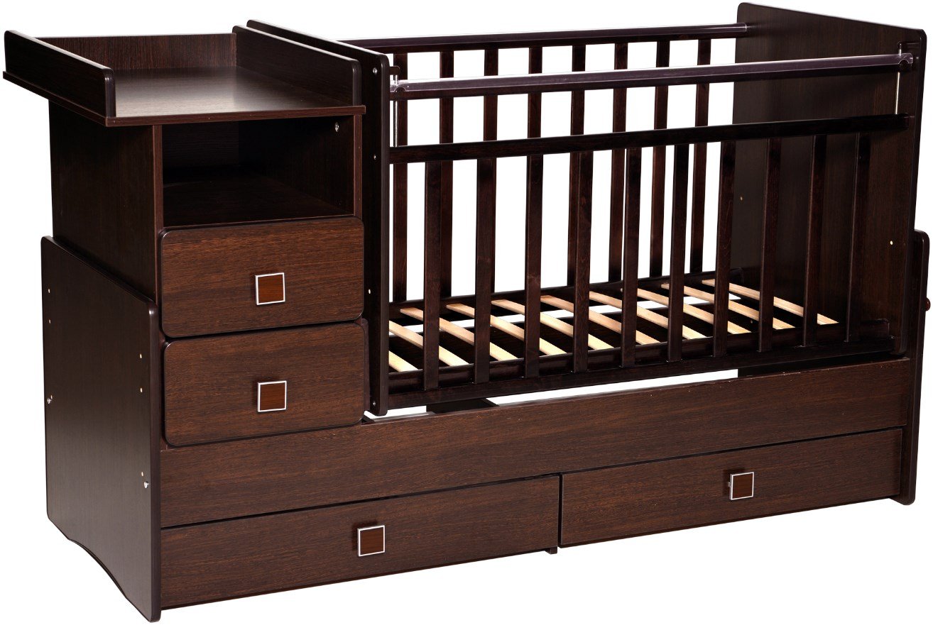 Cofre: un producto con varios cajones. El diseño combinado con la cama generalmente se hace un poco más alto que el estándar, acomodando uno o tres cajones para la ropa de cama y otras cosas debajo de la superficie para dormir. Una cómoda para la guardería está disponible en tres versiones: