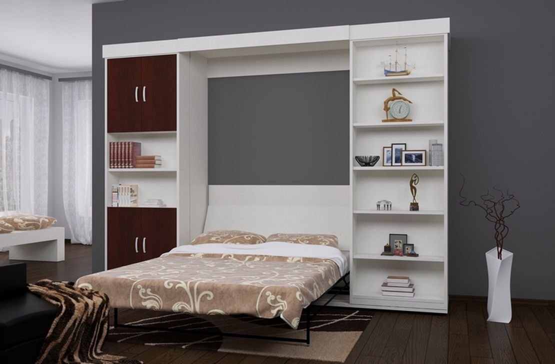 Este diseño es una cama elevadora unida con una cabecera o lateral a la parte inferior del armario empotrado. Es importante que el gabinete esté bien sujeto; de lo contrario, la estructura se volcará fácilmente cuando intente descomponerlo. Tal cama puede ser individual, una y media o doble, con estantes abiertos para libros, recuerdos o nichos cerrados en tres lados para ropa de cama, ropa interior, que se notan solo cuando la estructura está desplegada. La última opción por la noche parece una cama normal, con estantes con bisagras a cada lado, durante el día es parte de una pared lisa, con dos costuras apenas perceptibles.