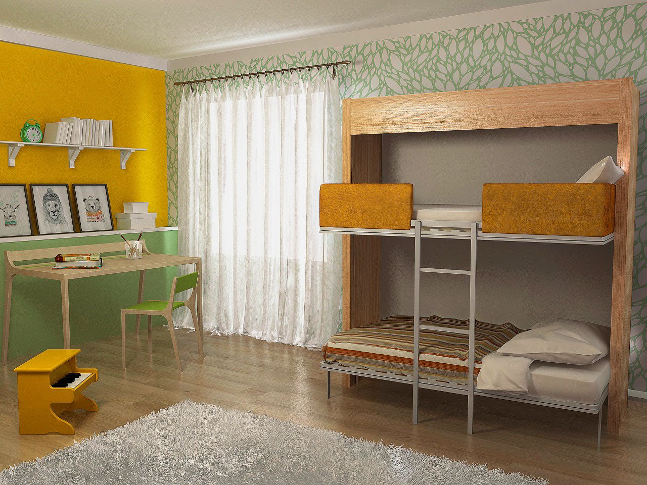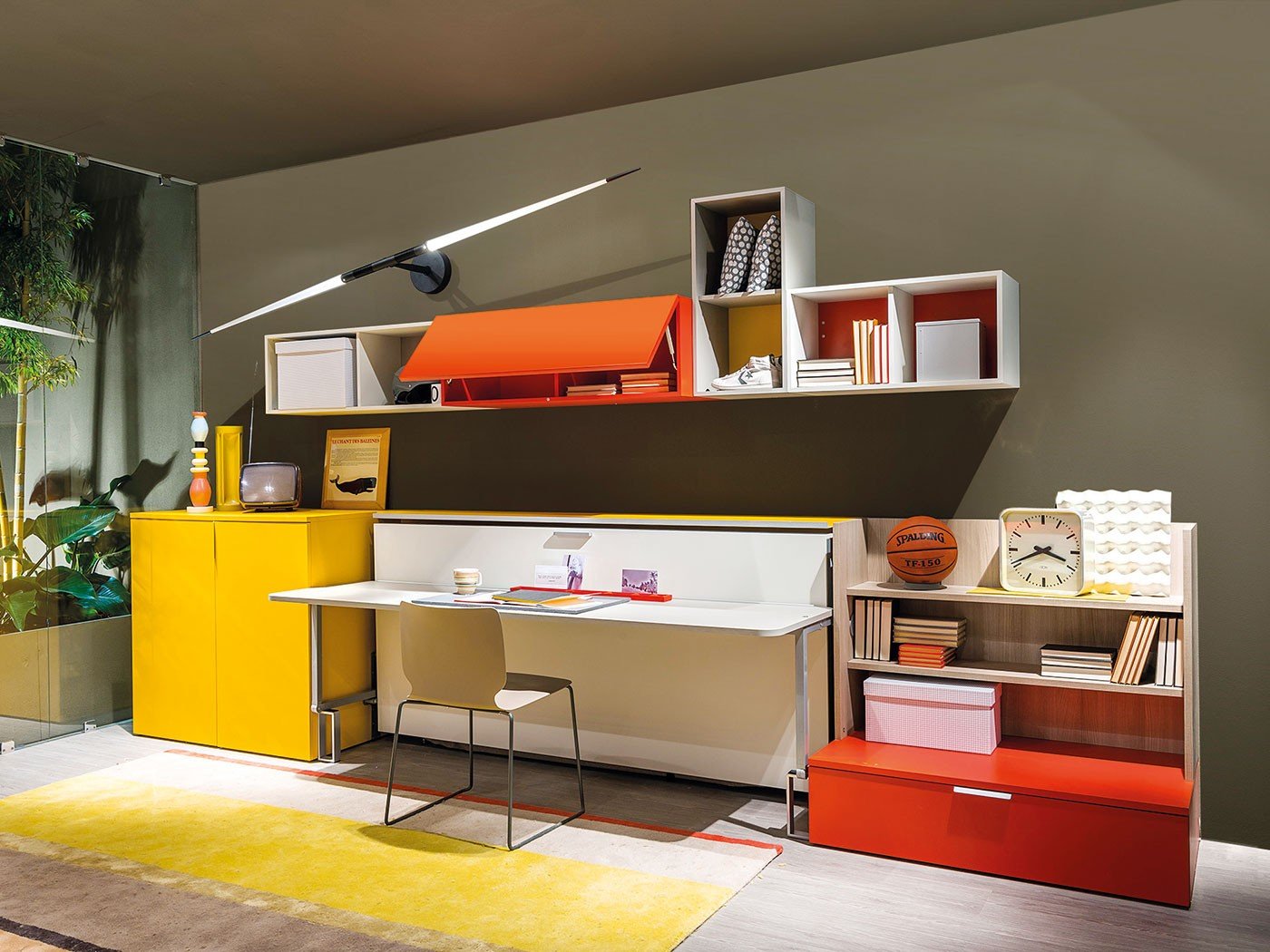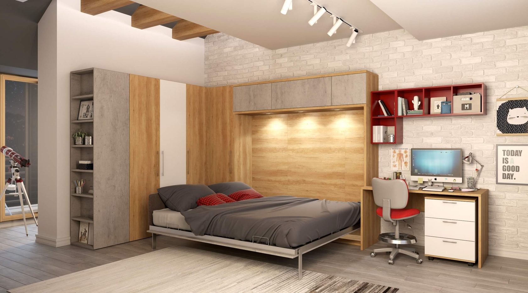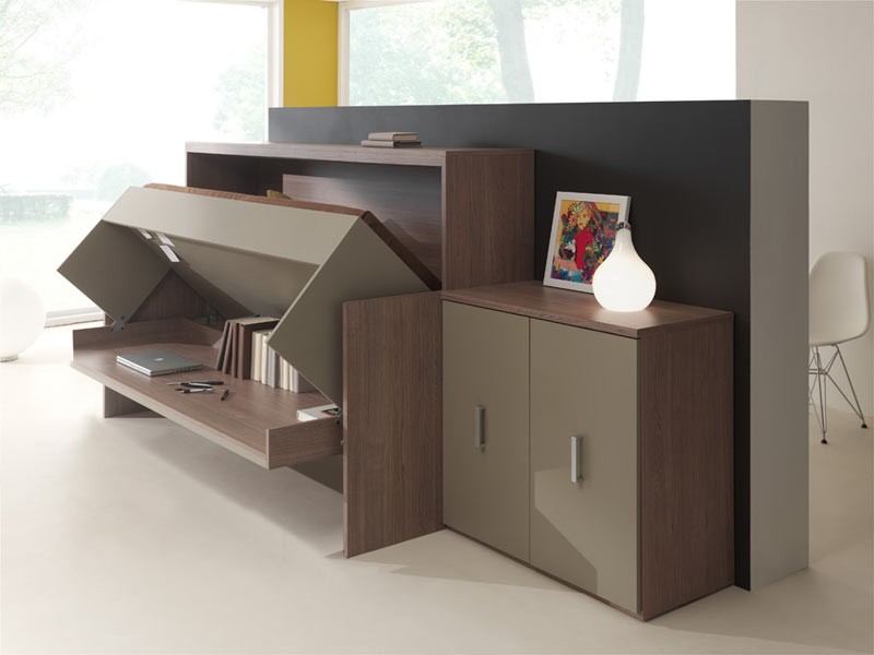 se puede plegar, desplegar en solo un par de segundos, convirtiendo la habitación en un dormitorio, un lugar para trabajar en un área de recreación;
