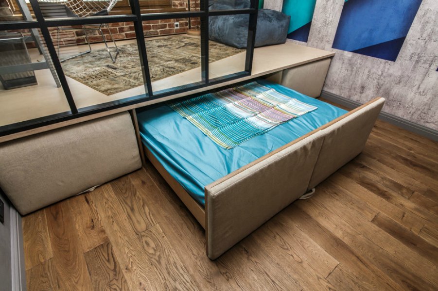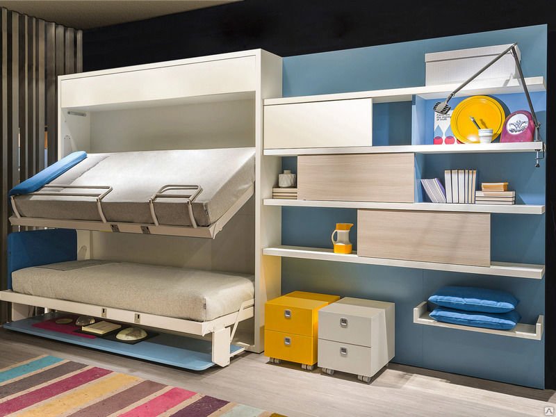 Tal estructura en la noche se convierte en un avión completo para un sueño confortable de dos o incluso tres personas, se desarrolla durante el día, convirtiéndose en muebles tapizados para sentarse. Las secciones de almacenamiento retráctiles, estantes abiertos y cerrados generalmente se encuentran a los lados del producto.