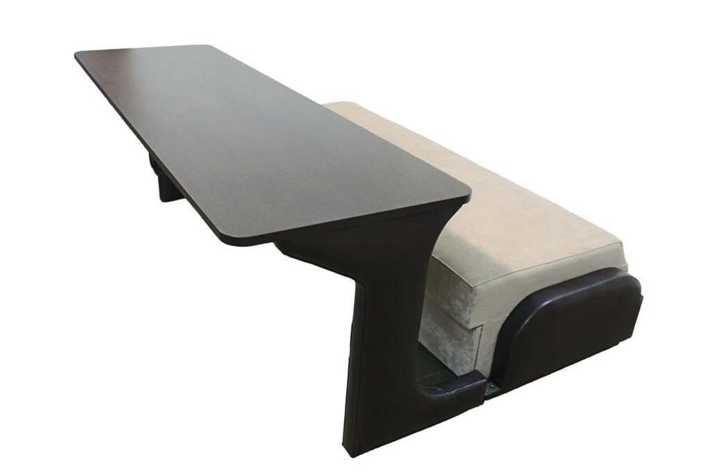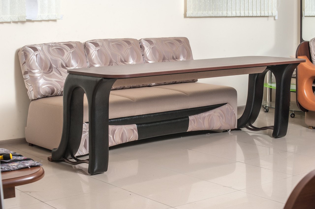 Este tipo de diseño a menudo se convierte en el elemento de zonificación del estudio, sala de estar, combinado con la cocina, etc.El producto es modular o simplemente plegable. Muy a menudo, la encimera es simultáneamente un respaldo de sofá y se quitan los reposabrazos. En otra realización, la superficie estrecha de la mesa está unida a la parte posterior del respaldo del sofá, representando una especie de barra de bar. También hay productos en los que una pequeña mesa se reclina desde el reposabrazos, se construye en el medio, girando una de las almohadas.