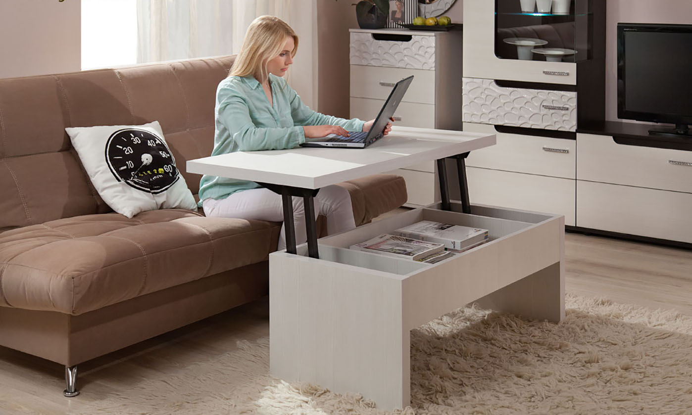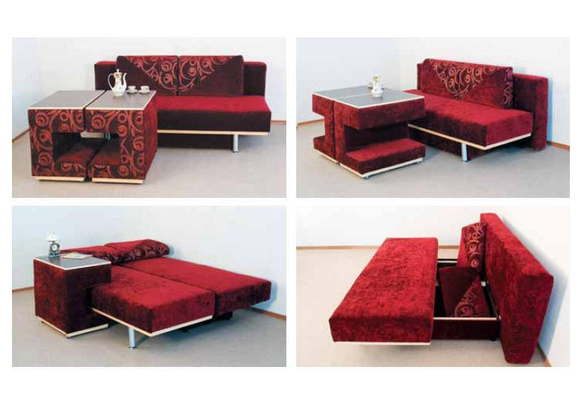 Una opción interesante es una mesa de café que se puede convertir de una mesa de servicio.Un pequeño armario transformable se convierte fácilmente en una computadora, mientras que es un lugar para almacenar utensilios domésticos, un vestidor. En un compartimento de esquina, a menudo se equipa un mini gabinete. La pared del sofá tiene un respaldo alto que, si es necesario, se puede convertir en un plano para dormir completo para dos personas, generalmente tiene varios estantes, también mutables. Un sofá de cocina plegable esconde un minibar en uno de los reposabrazos y secciones para utensilios, mantelería en el otro.
