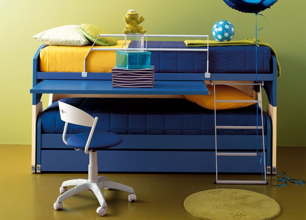 Una cama para dos niños.Uno de los planos para dormir se encuentra arriba, y debajo está el segundo, disfrazado como un amplio cajón. Los espacios de almacenamiento compactos se configuran en la parte inferior;