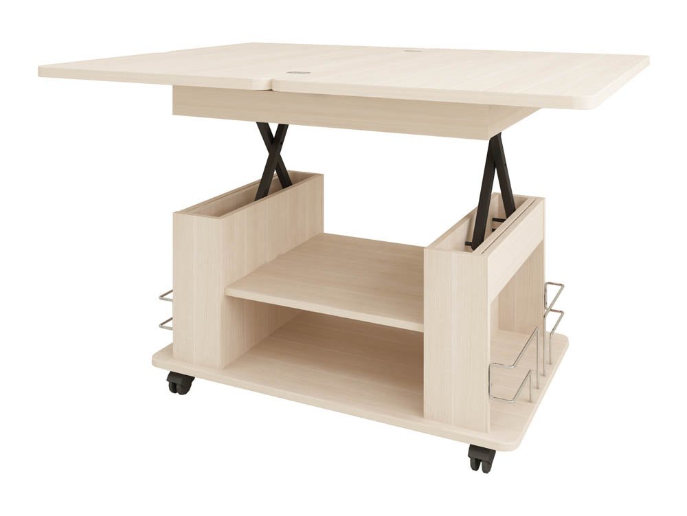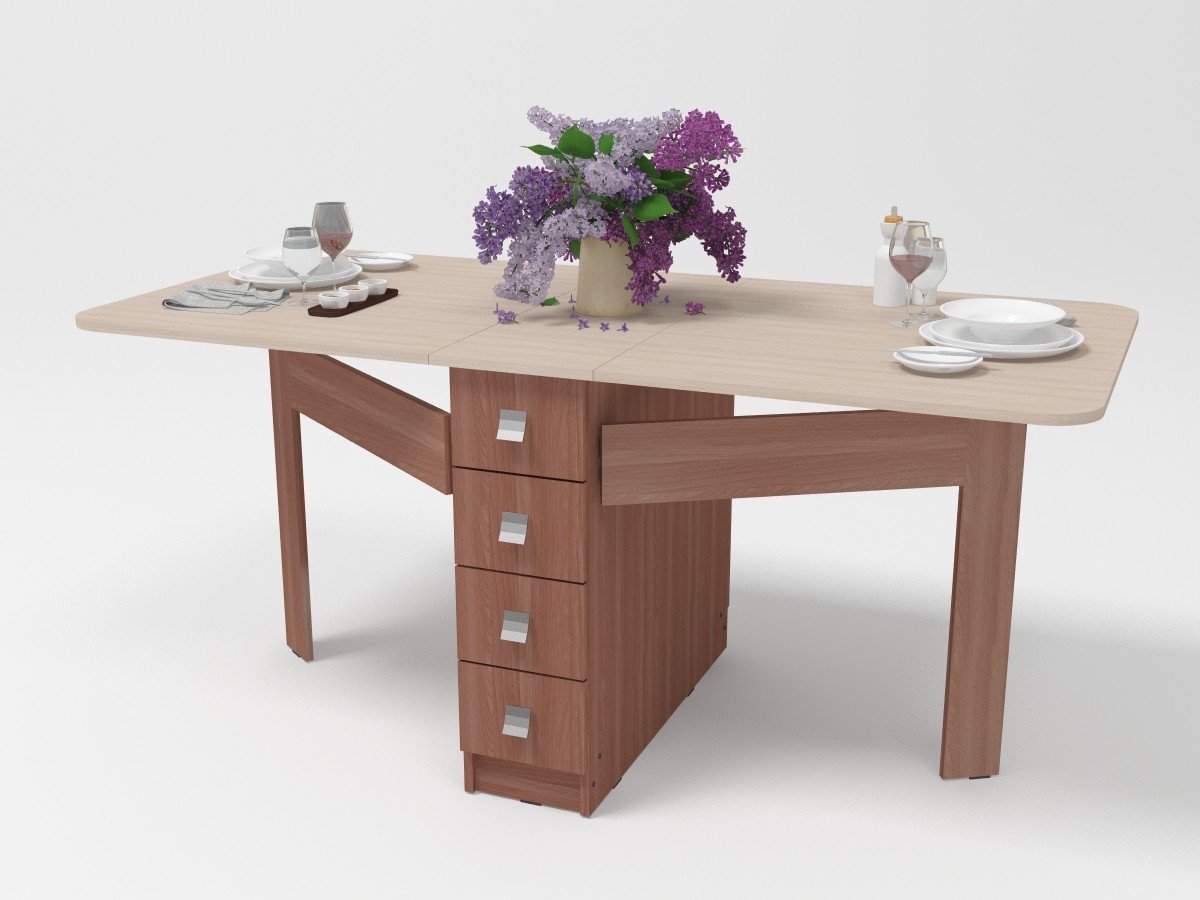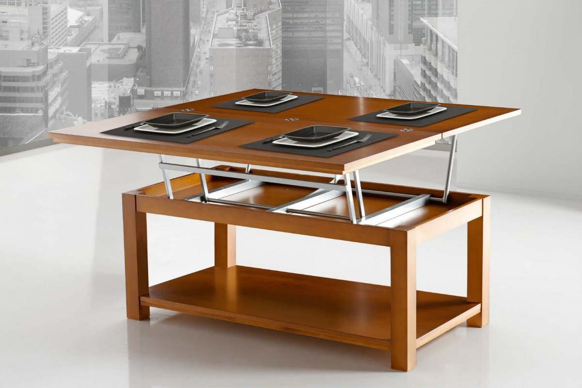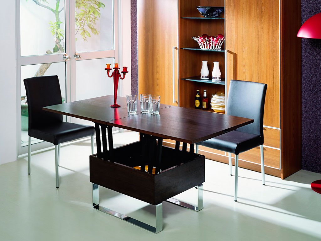 plegable: se presenta, aumentando no solo el tamaño de la superficie, sino también la altura. Tal mesa se transforma fácilmente en otro objeto;