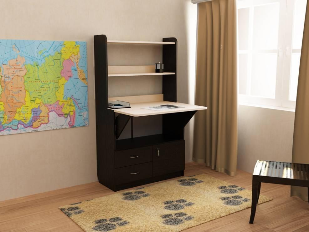 El estante, visto desde un lado en forma de triángulo, está equipado con un plano plegable en la parte inferior, que sirve como un escritorio compacto o una mesa de computadora. El gabinete de pared, decorado en una parte con un sofá o una cama plegable, en la otra con una mesa llena, tiene todo tipo de estantes, cajones y, a menudo, es el único mueble en un apartamento tipo estudio en miniatura.
