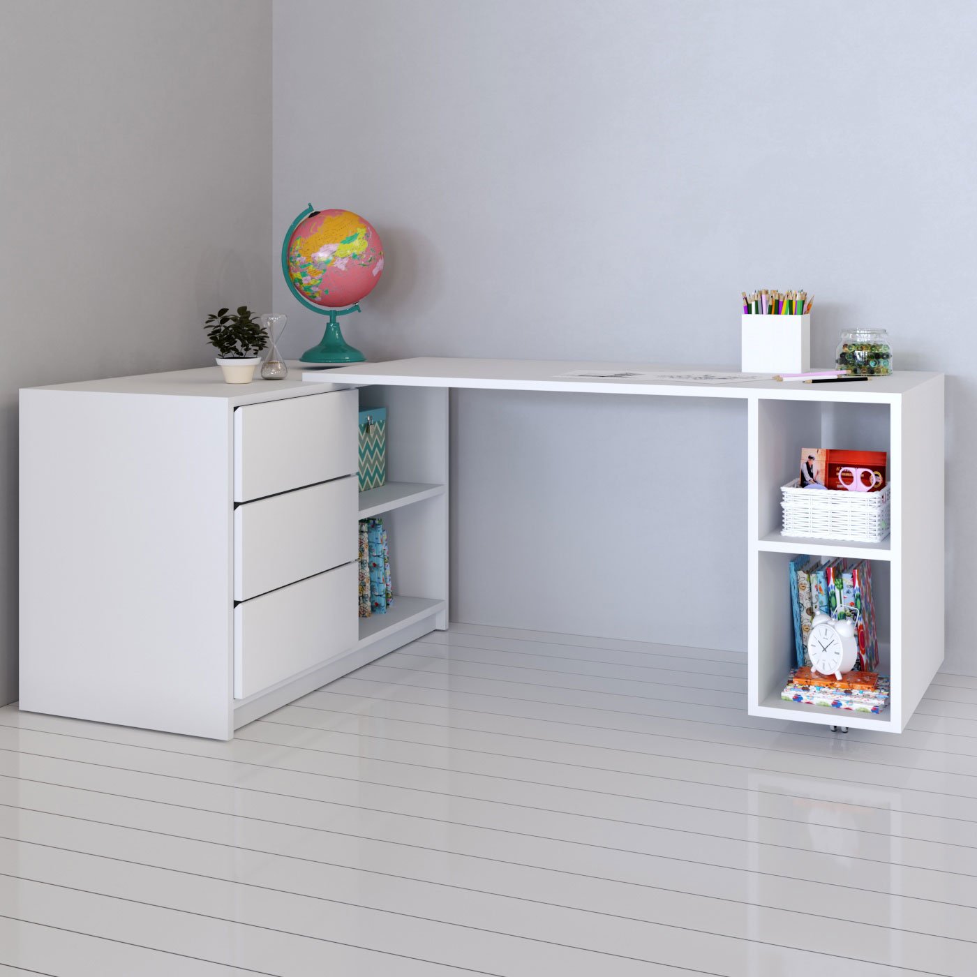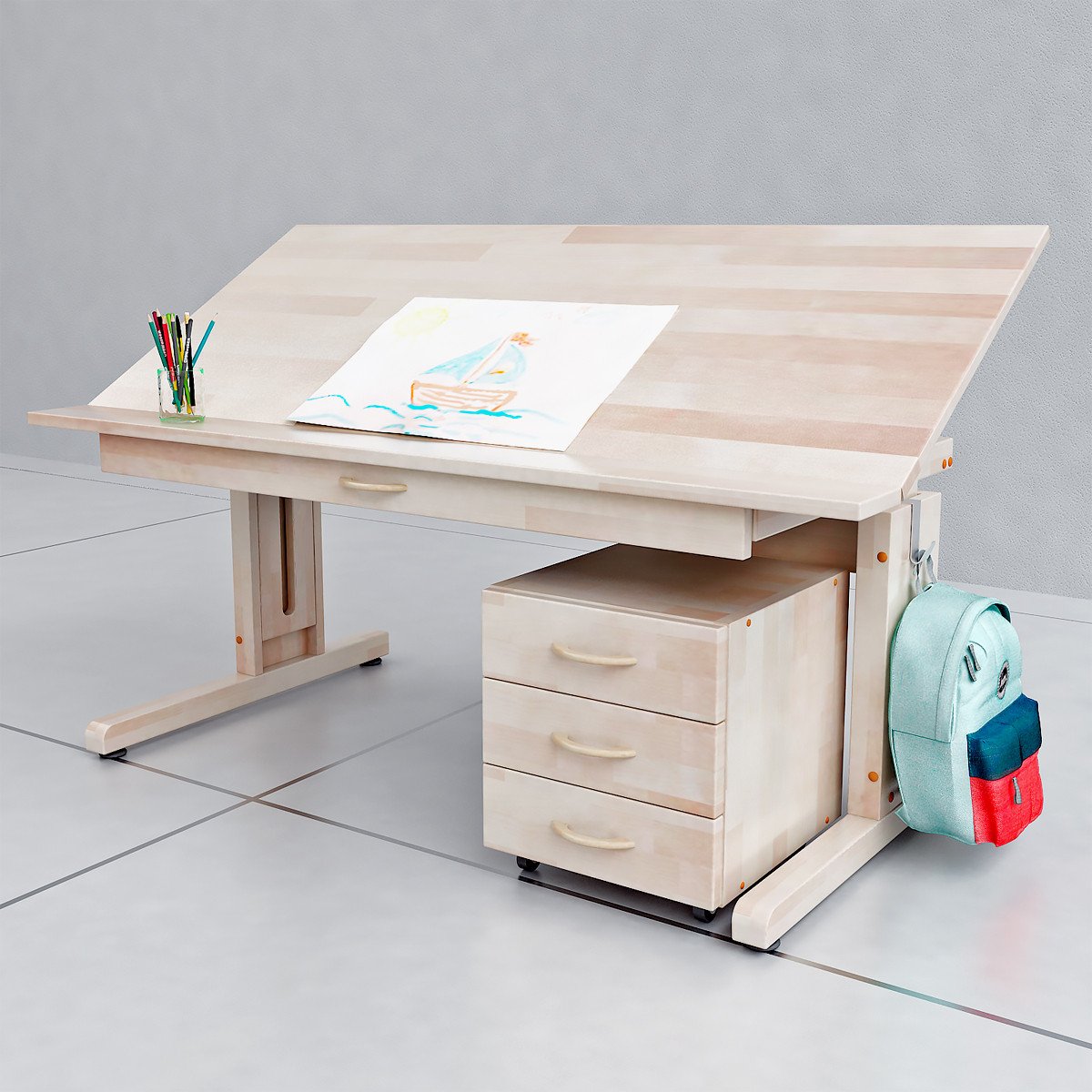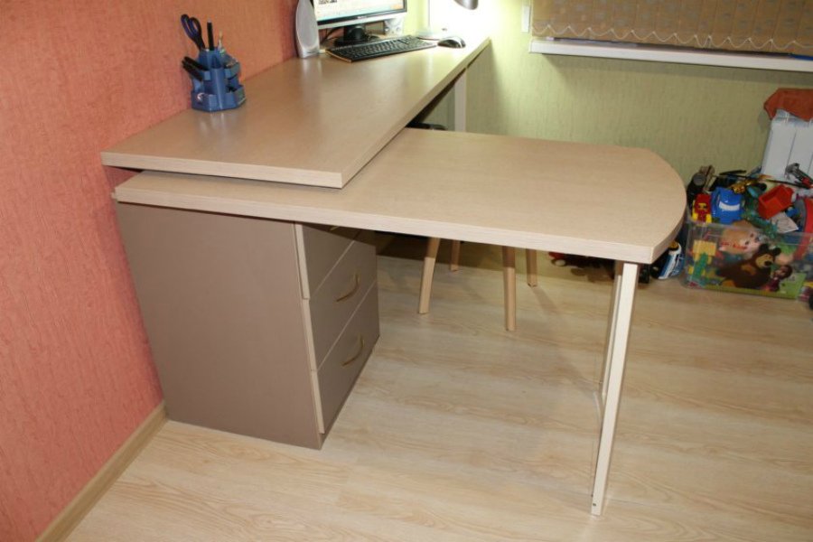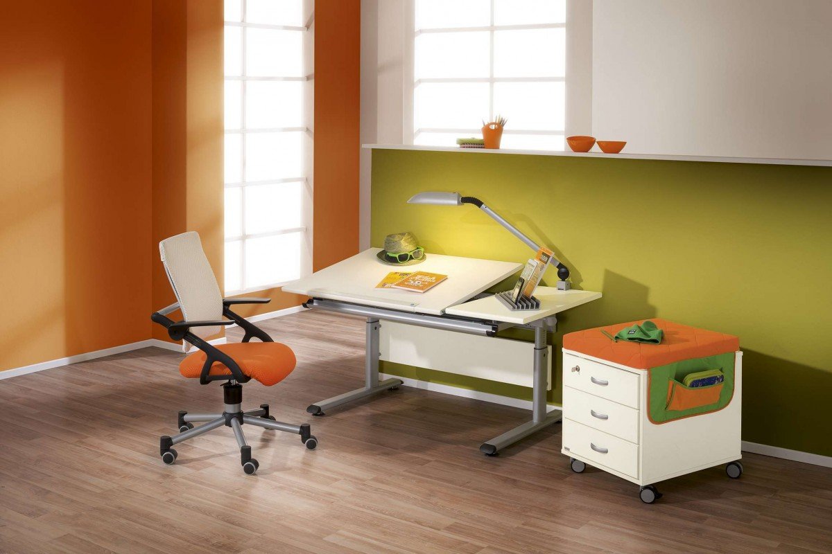 Generalmente se compra un escritorio para el estudiante. El diseño puede variar dentro de amplios límites no solo la altura, sino también el ángulo de inclinación de la encimera. Es fácil doblarlo al tamaño de una mesita de noche compacta para que en su tiempo libre de completar las lecciones, libere espacio en la guardería para juegos, deportes.