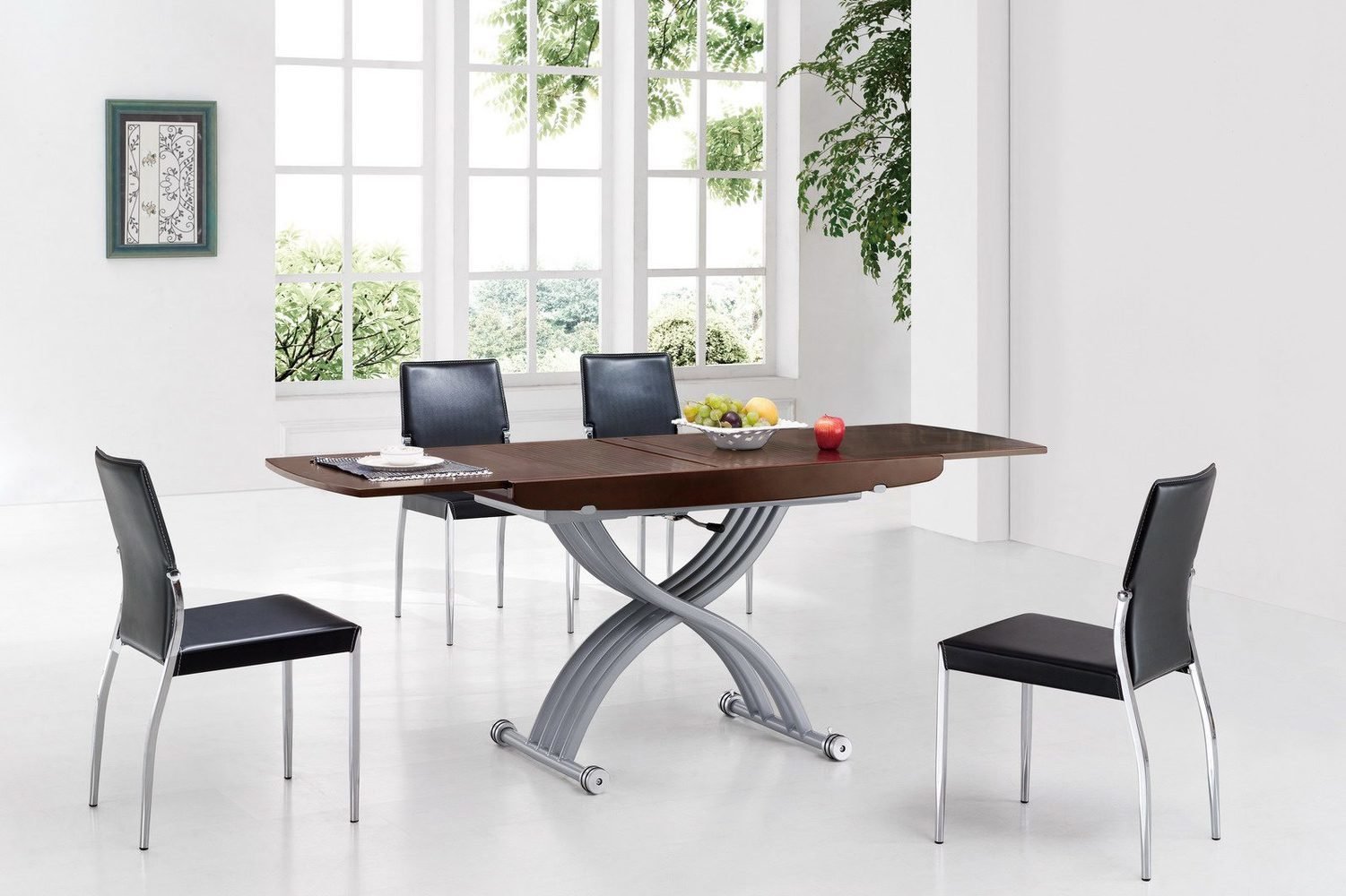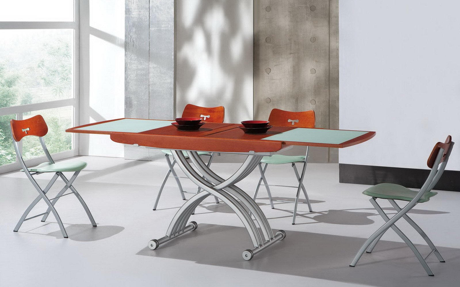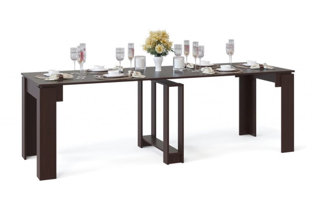 El producto está destinado a comer: cuando se coloca la mesa, puede acomodar fácilmente de dos a ocho personas. La superficie de trabajo del artículo se transforma de pequeña a grande, aumentando al mismo tiempo varias veces. La altura de la estructura no se puede cambiar en la mayoría de los casos.