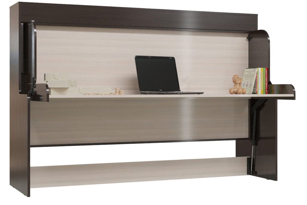 el lugar para dormir se apoya contra la pared, escondiéndose debajo de un estante. La tabla, que desempeña el papel de "pata", sobre la cual descansa la cama cuando está desplegada, se convierte en una mesa estrecha;
