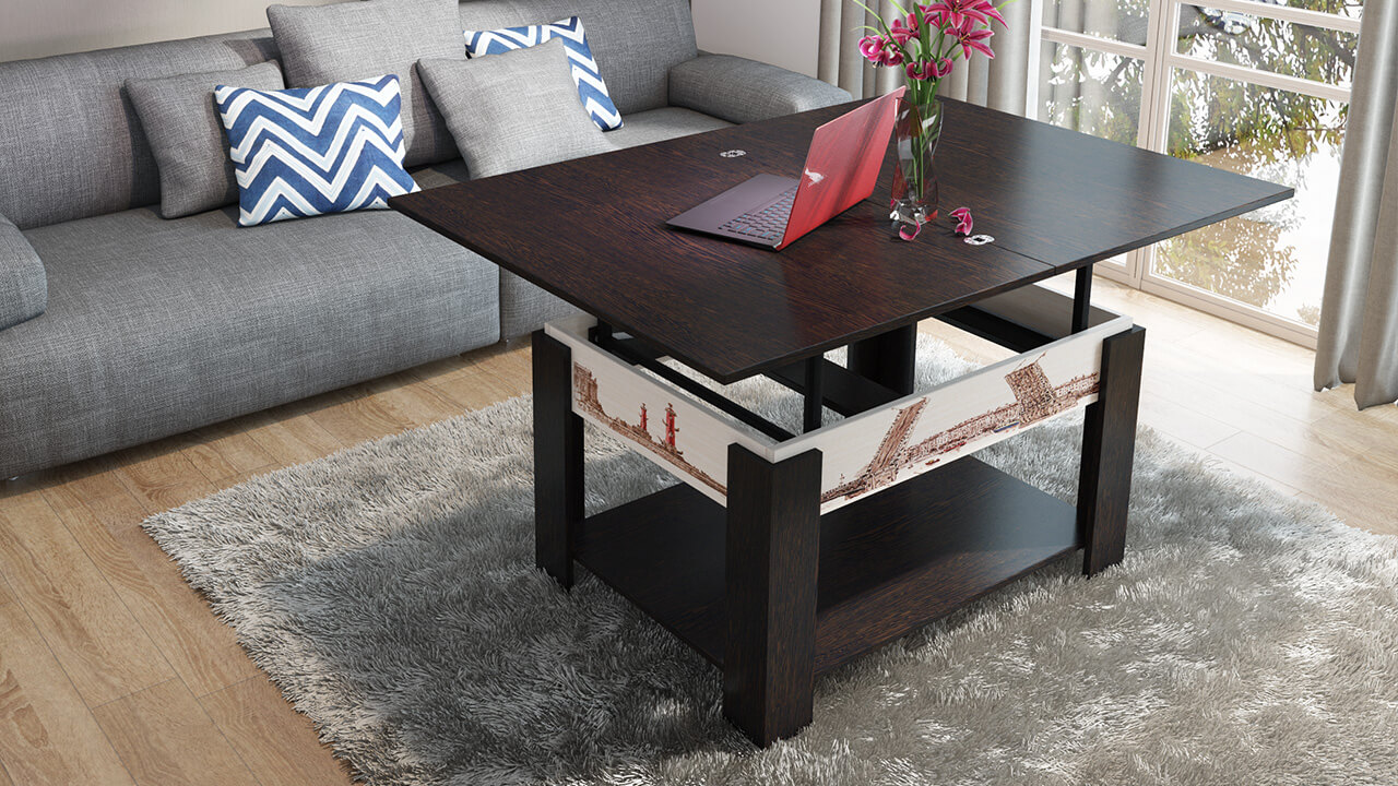 Una mesa de varios niveles se utiliza como mesa de centro y como comedor, ocultando un conveniente sistema de almacenamiento debajo de la superficie de la mesa. La estructura articulada con una mesa, en forma desplegada, que tiene un espejo en la parte inferior, que es un soporte, en el estado plegado no se puede distinguir de un espejo simple en un marco suspendido en una pared.