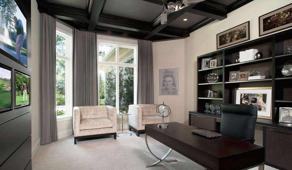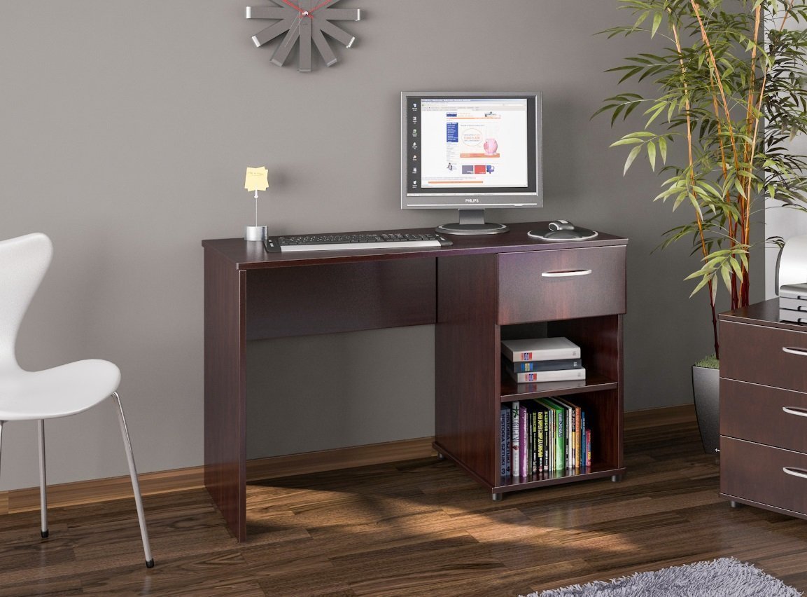 El color de wengué en el interior del gabinete será muy útil. Los muebles lacónicos agregarán rigor a la habitación, una cierta cuota de formalidad y notas aristocráticas. Los tonos de madera marrón oscuro disciplinan perfectamente y contribuyen al trabajo intelectual. La mayoría de los gabinetes están decorados en un estilo clásico o minimalista. Aunque está permitido usar otras direcciones estilísticas en el interior.