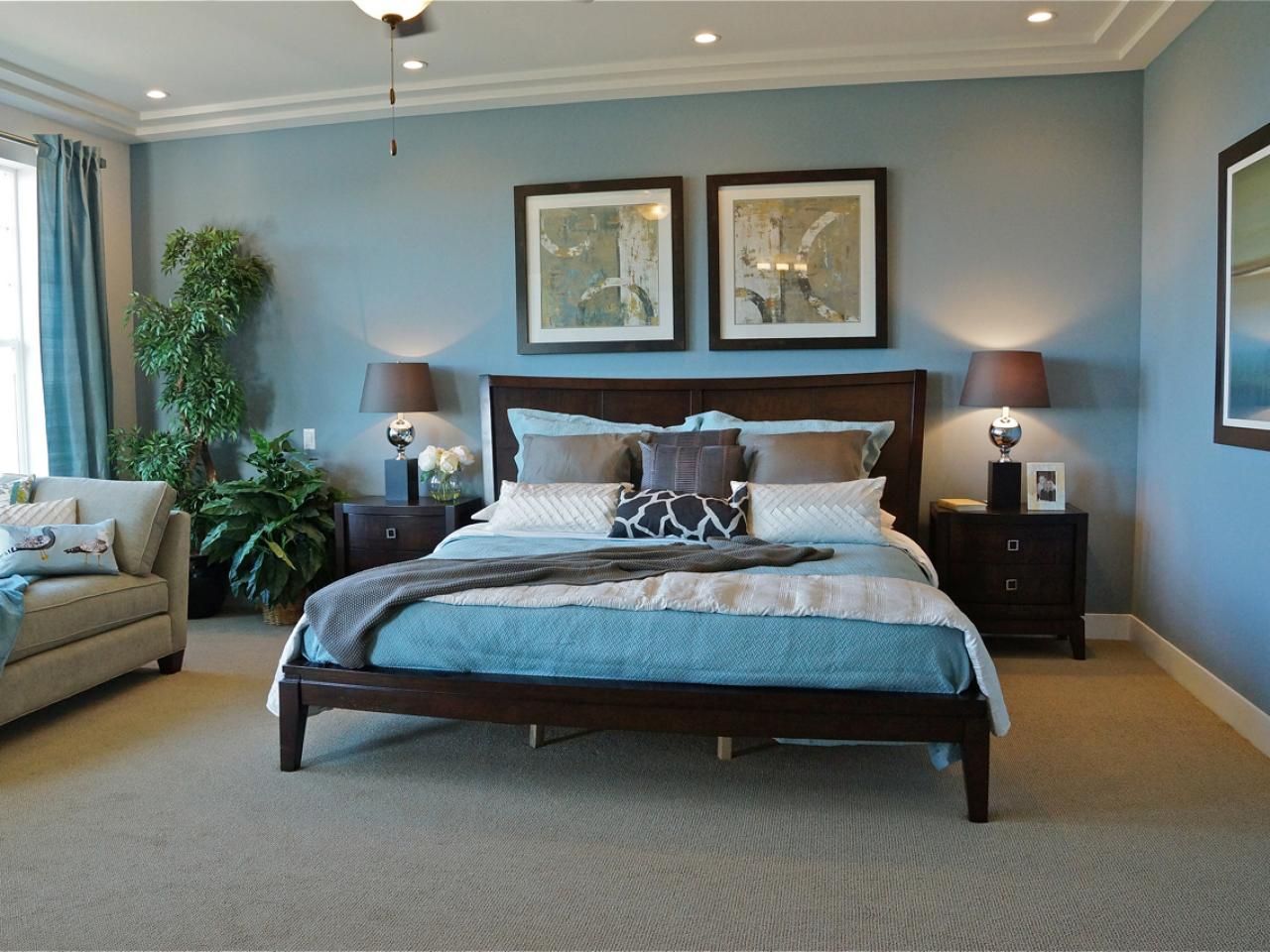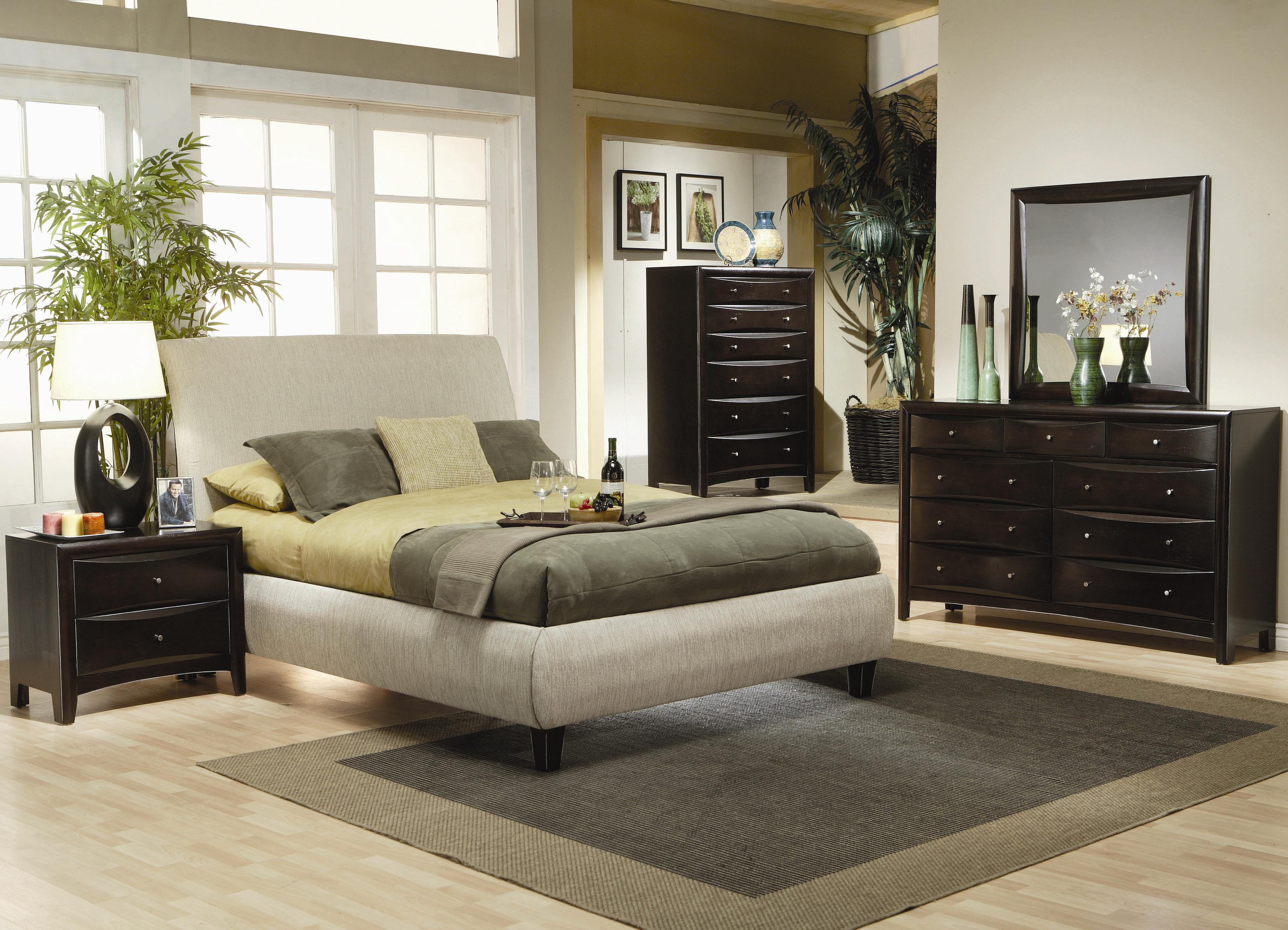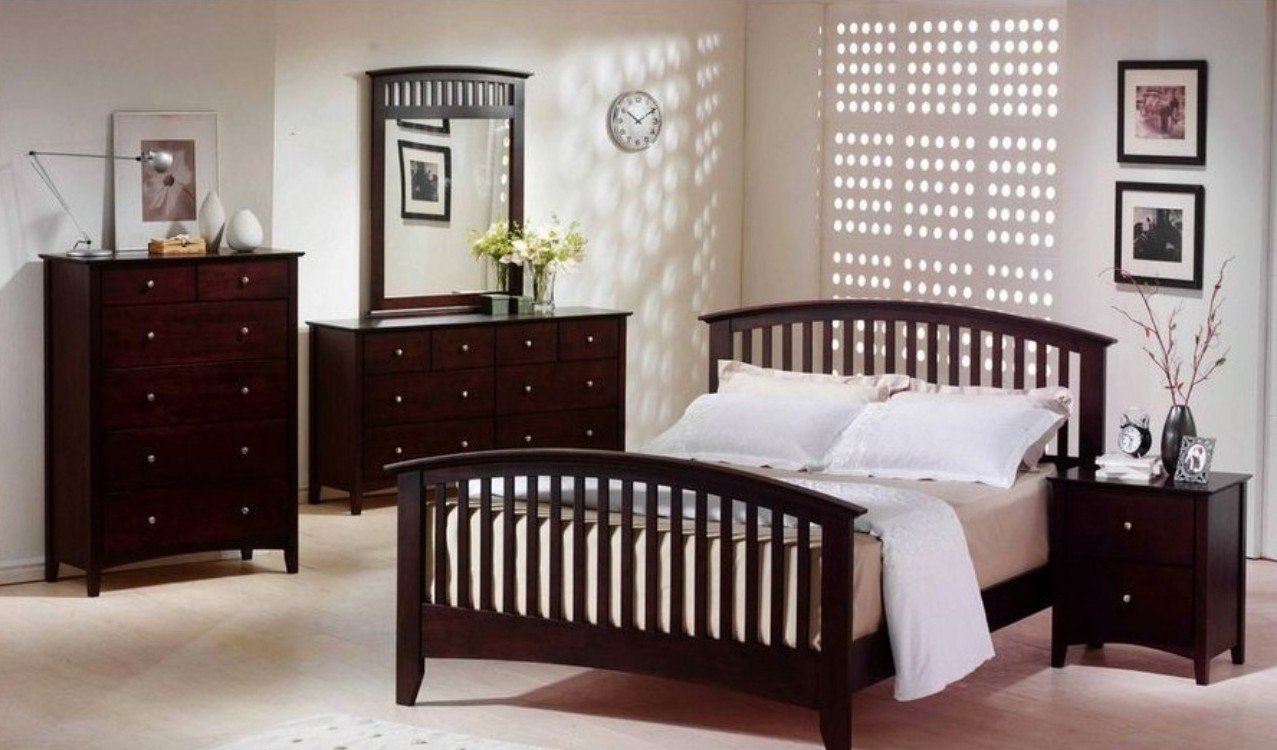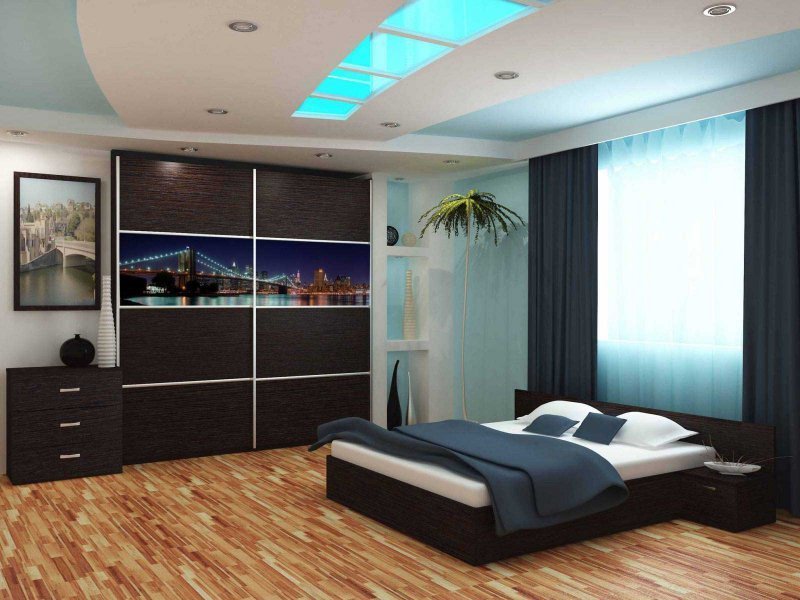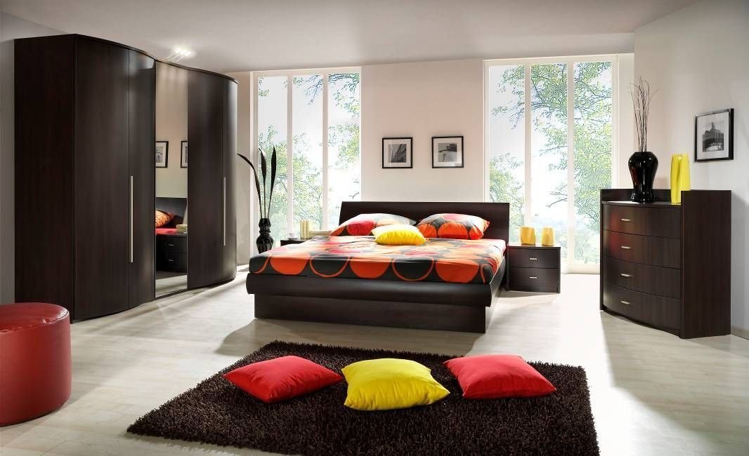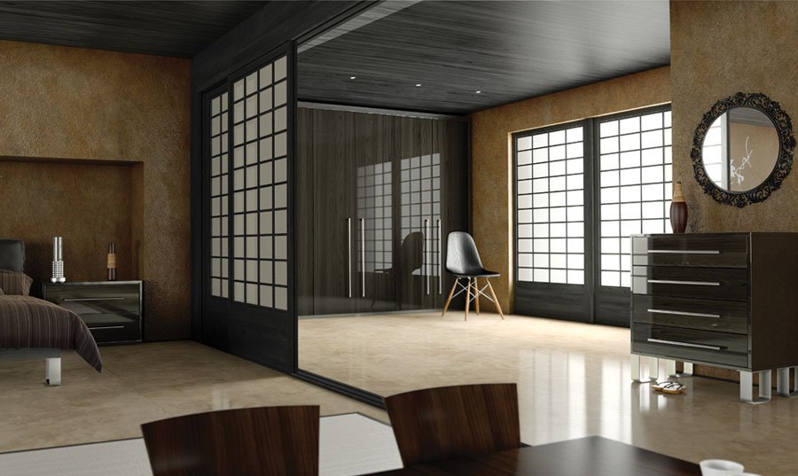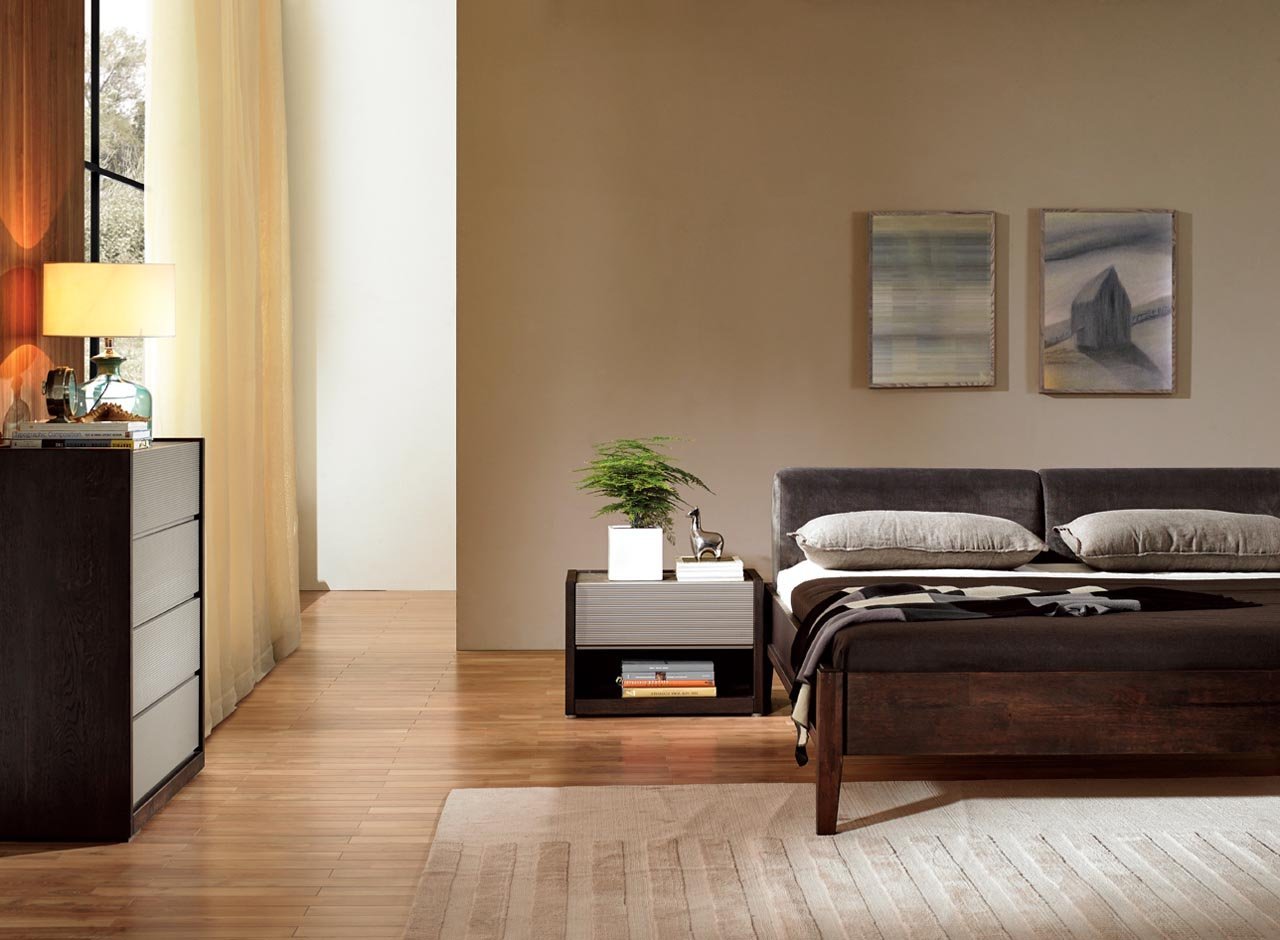 Con la ayuda de colores saturados, es posible crear un ambiente elegante o exótico lacónico en el dormitorio. Los muebles lacónicos de madera oscura se combinan con éxito con el estilo asiático. Los tonos chocolate en el dormitorio armonizan con tonos mostaza, rosa, azul, turquesa y otros tonos claros. Los acentos vívidos también son apropiados aquí, pero no olvides observar las proporciones correctas. Detrás de la cabecera de la cama, el sitio se puede decorar con paneles de pared de wengué, decorados con una imagen contrastante, una foto o agregar estantes, que posteriormente colocan detalles decorativos.