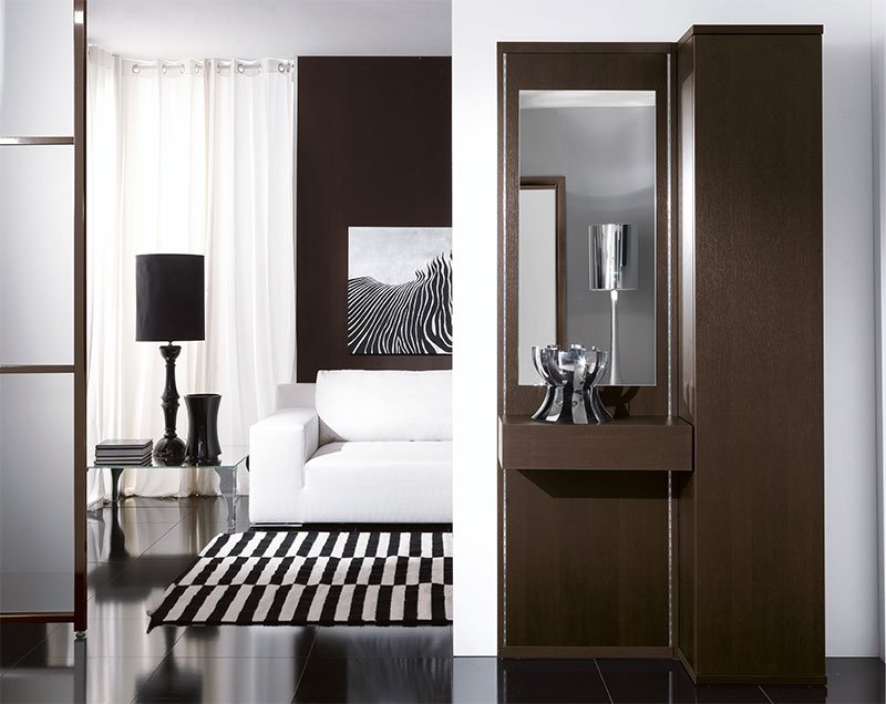 En un pasillo pequeño, los muebles de wengué combinados con tonos claros se verán apropiados. La decoración de las paredes coincide con el tono de la parte clara de la madera. Esto puede ser papel tapiz, pinturas de bambú, marcos decorativos de madera y otros detalles. Las cortinas a menudo se combinan con un tono más claro que los muebles. En habitaciones pequeñas, vale la pena agregar elementos espejados y considerar cuidadosamente el esquema de iluminación. En grandes y espaciosos pasillos está permitido usar armarios oscuros, cómodas. Puede decorar las paredes con paneles de pared, papel tapiz. El ladrillo también se ve armoniosamente en las paredes. Es recomendable utilizar superficies brillantes y mate en la habitación.
