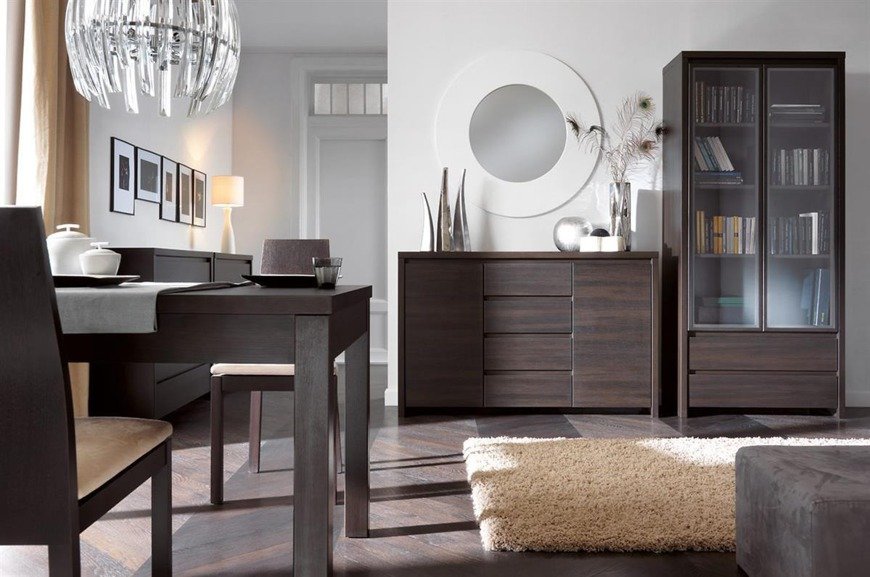 Los muebles de color wengué siempre lucen lujosos en interiores modernos. El árbol de wengué es uno de los tipos de madera más caros. Tiene excelentes características de calidad, alta resistencia al estrés, durabilidad. Externamente, la madera en tonos oscuros se ve exótica y prestigiosa. Muebles, pisos, puertas, escaleras y otros elementos interiores están hechos de este material. Los productos de madera natural son bastante caros. Permitir tal adquisición solo puede personas adineradas.