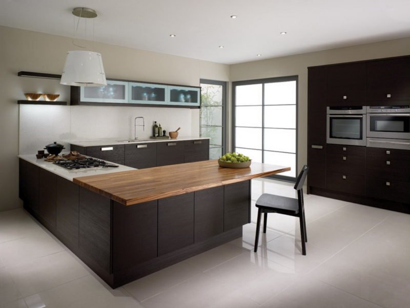 Wenge llega al interior de una espaciosa cocina. En habitaciones pequeñas de 7 metros cuadrados o menos, es mejor no usar muchos colores oscuros. Pequeños fragmentos permitidos.La madera de alta calidad es apropiada en lugares donde muchos procesos de trabajo ocurren diariamente. Las áreas oscuras del acabado se consideran la opción más práctica. En la cocina, para una combinación exitosa con wengué, debe elegir tonos blancos, vainilla lechosos y beige de cama. Acentos agradables, estantes originales, platos decorativos, imágenes coloridas y otros detalles se seleccionan para la gama seleccionada.