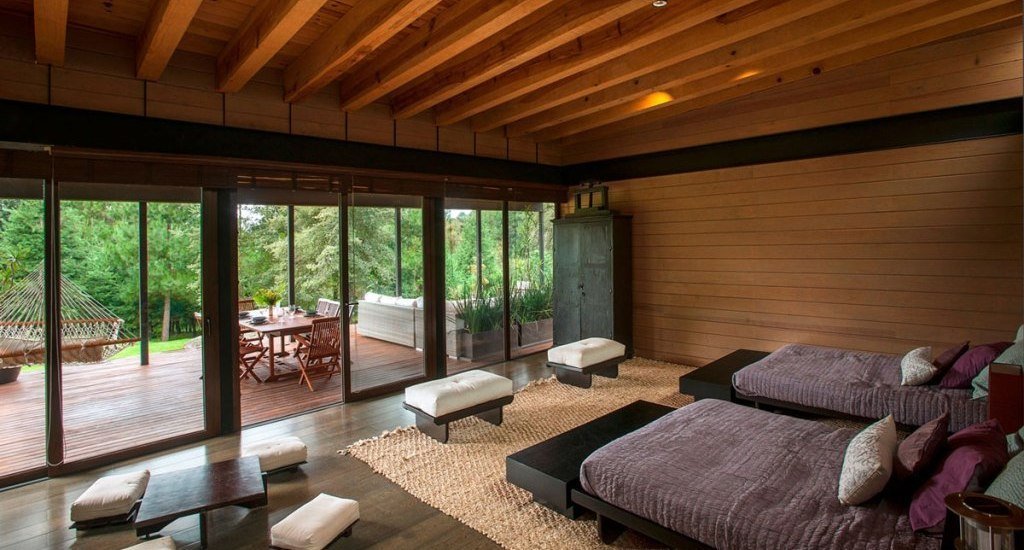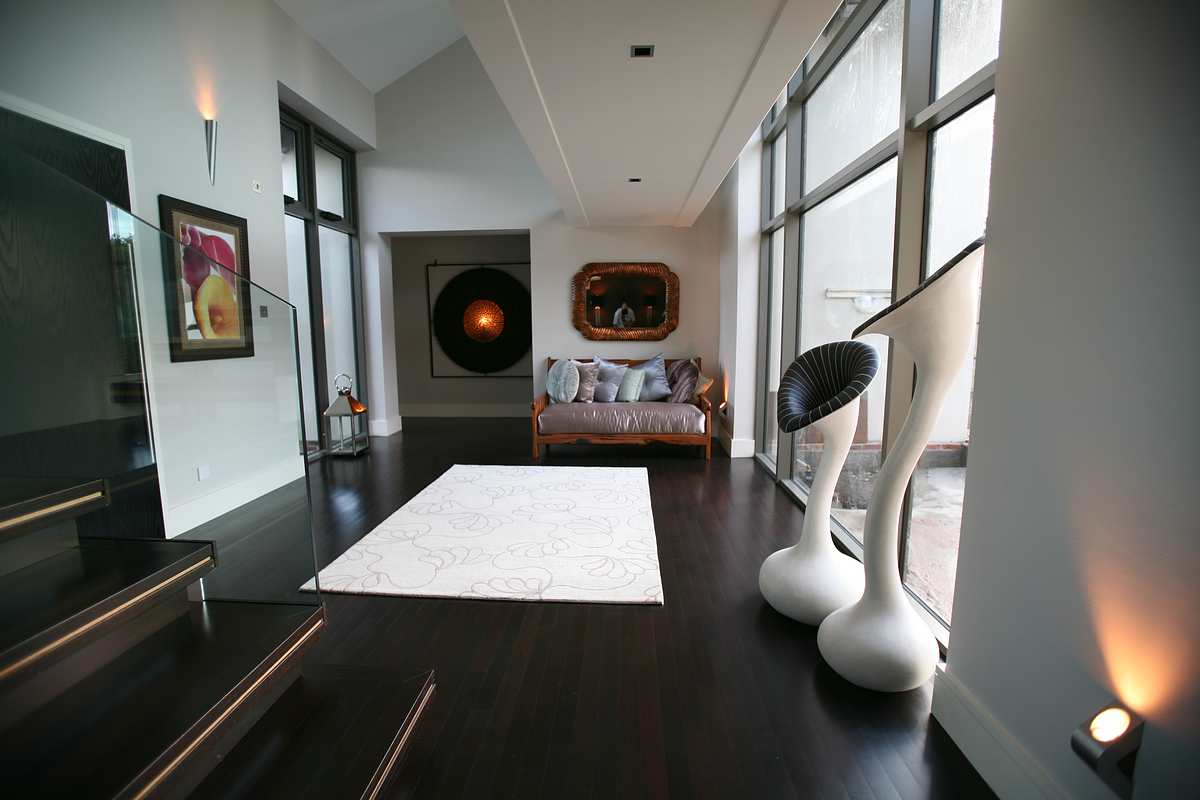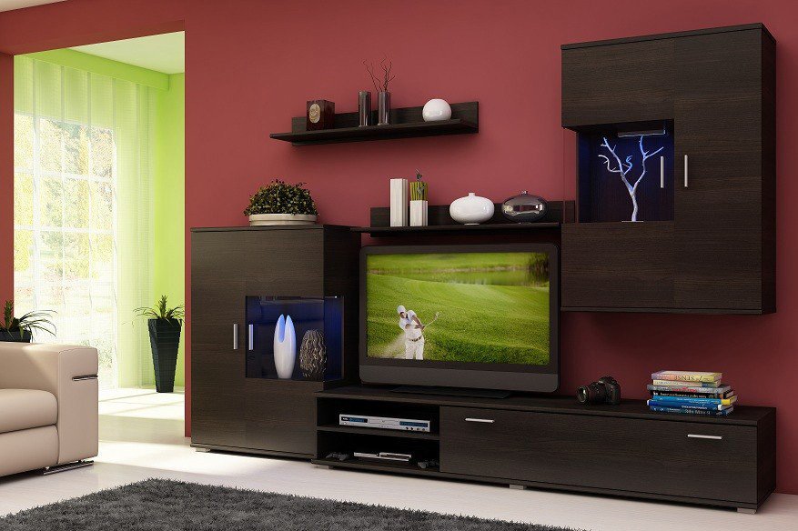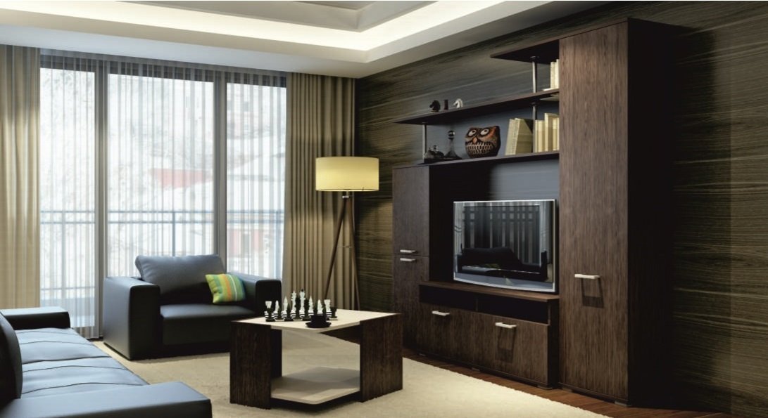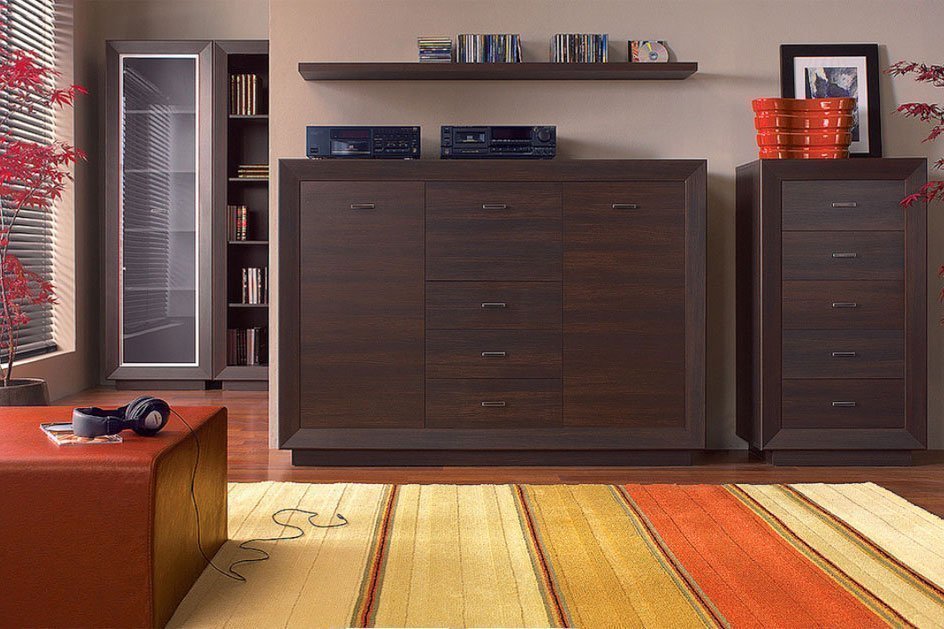 La madera de wengué costosa, lujosa y exótica es perfecta para decorar la sala de estar y los grandes salones. Los tonos oscuros de la madera le dan elegancia a la habitación. Las superficies de madera de wengué desempeñan el papel de elementos básicos en la sala de estar. Se combinan con amarillo, blanco, beige, gris, verde y dorado. Wenge se adapta a las salas de estar en un estilo clásico inglés, mediterráneo, étnico, de alta tecnología y en un minimalismo moderado.