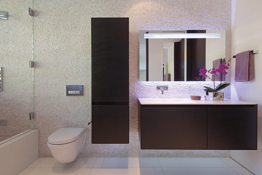 Si el baño tiene una tubería predominantemente blanca instalada, entonces, contra su fondo, el wengué se verá lujoso y elegante. Suaves tonos florales y verdes también son adecuados aquí. Los elementos metálicos con un brillo de acero o dorado, así como las superficies de espejo, son apropiados. Recordemos que la madera tolera la alta humedad. Por lo tanto, para el baño el material será una opción adecuada.