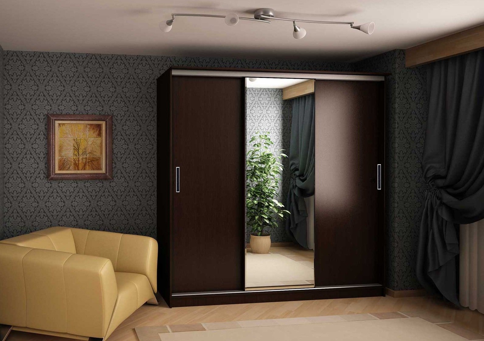 Las grandes superficies de espejo agregan más luz al espacio. A menudo se usa para agregar luz a una habitación. Además, los espejos se combinan perfectamente con un árbol exótico. Para la noche, es preferible utilizar fuentes de luz primarias y secundarias. Por ejemplo, grandes lámparas brillantes en el centro de la habitación, a lo largo de los bordes de pequeños focos. Un sistema de iluminación bien diseñado es un componente importante de los proyectos de diseño exitosos.