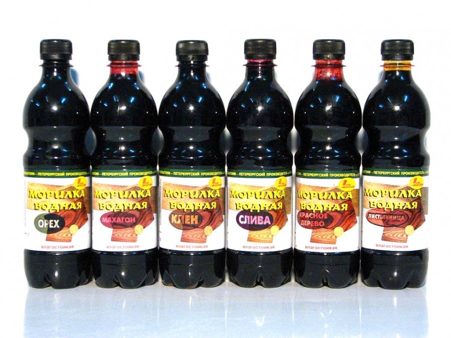 Trabaje con una mancha de agua, hágalo usted mismo. La tecnología consiste en remojar previamente y lijar piezas. El papel de esmeril elimina bien los pelos levantados. Antes de usar, la composición se filtra y se mezcla bien.Es posible aumentar la resistencia a la humedad con la ayuda de un acabado de barniz.