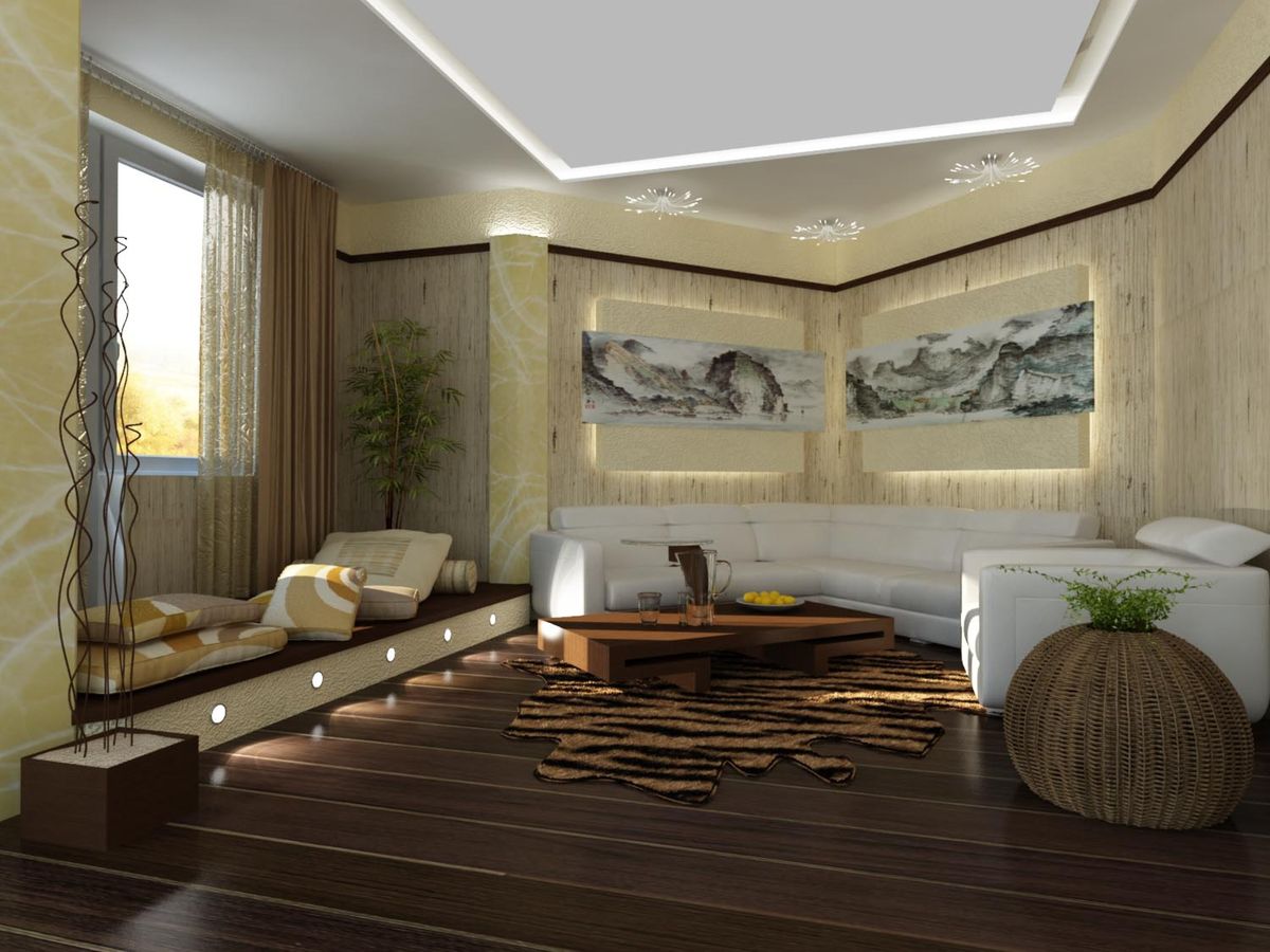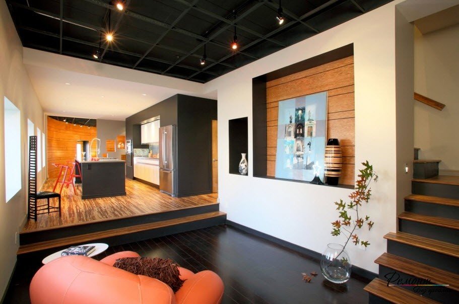 De lo contrario, puede sentir que el techo está colgando demasiado bajo, lo que provocará molestias.Si la configuración de la sala lo permite, puede construir una plataforma de medio metro, que puede convertirse en el tema principal del interior y al mismo tiempo enfatizar techos altos no estándar.