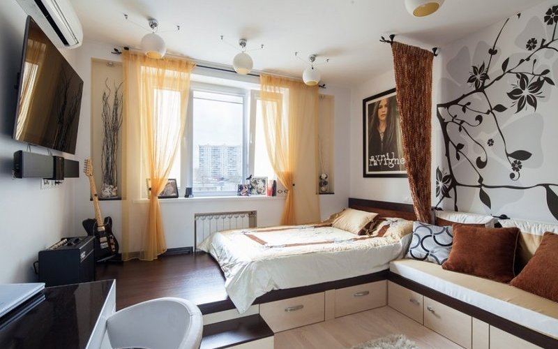 La especificidad de un apartamento de una habitación es la necesidad de crear condiciones para dormir, trabajar y recibir invitados en la misma habitación. La tarea se resuelve mediante una plataforma alta, decorada en un estilo oriental. Reemplazará tanto un sofá para invitados como una cama para propietarios. Características características de este diseño: