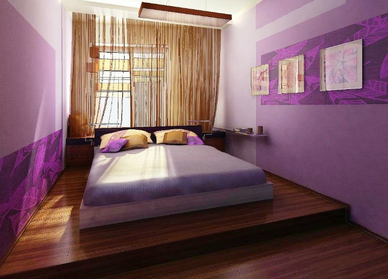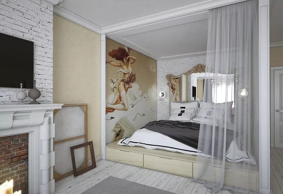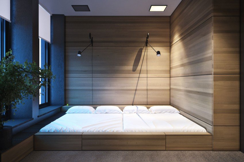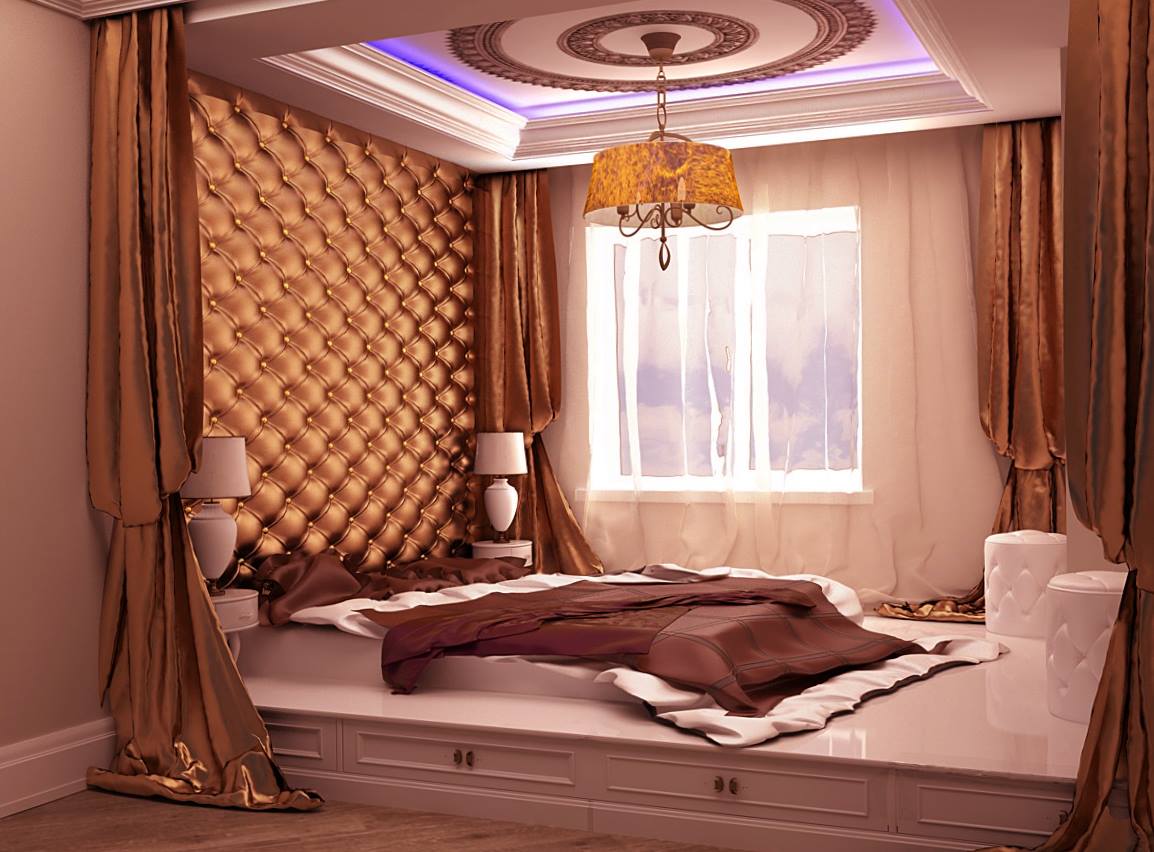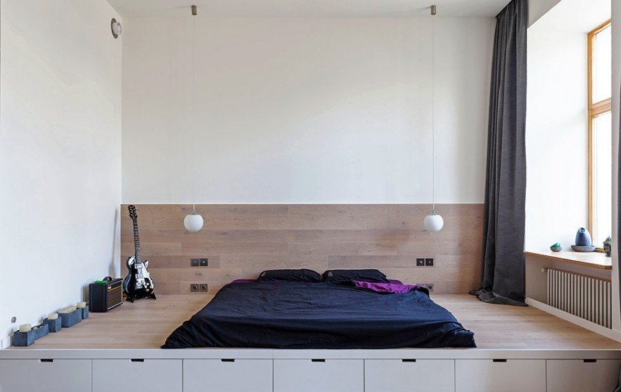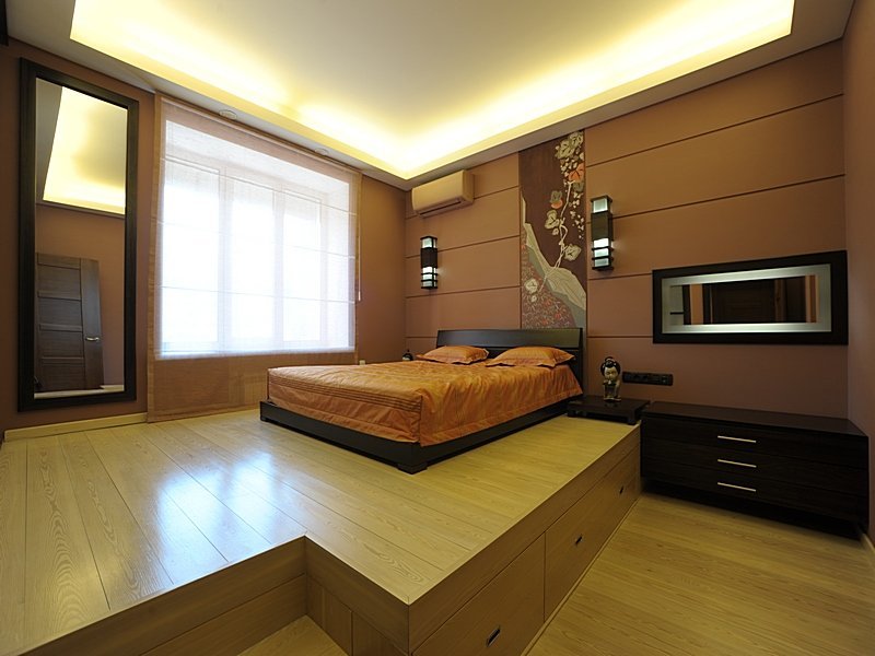 Una habitación larga y estrecha, un pequeño podio redondo se dividirá bellamente por la mitad. Otra opción es establecer la elevación justo al lado del muro estrecho, pero no cerca de la ventana. La habitación se volverá mucho más cómoda.Para habitaciones cuadradas, son adecuados los podios estrechos y altos, dentro de los cuales hay espacios de almacenamiento. La cama empotrada también será cómoda, ya que no tiene que hacerse con cuidado todas las mañanas y antes de que lleguen los invitados.