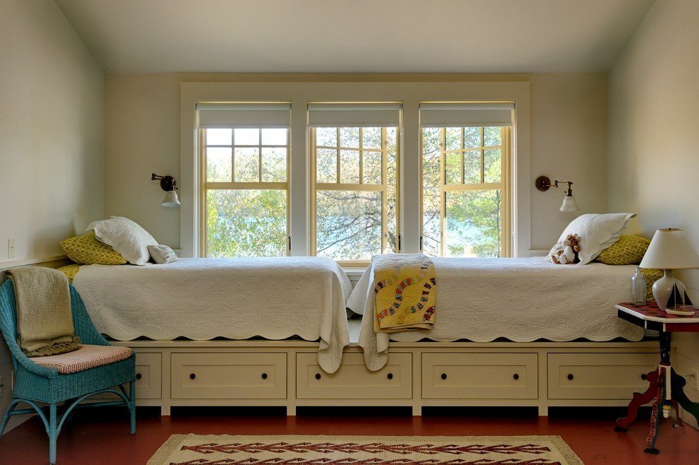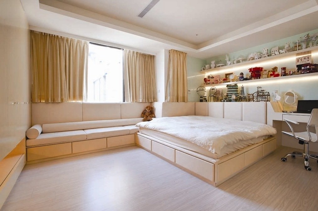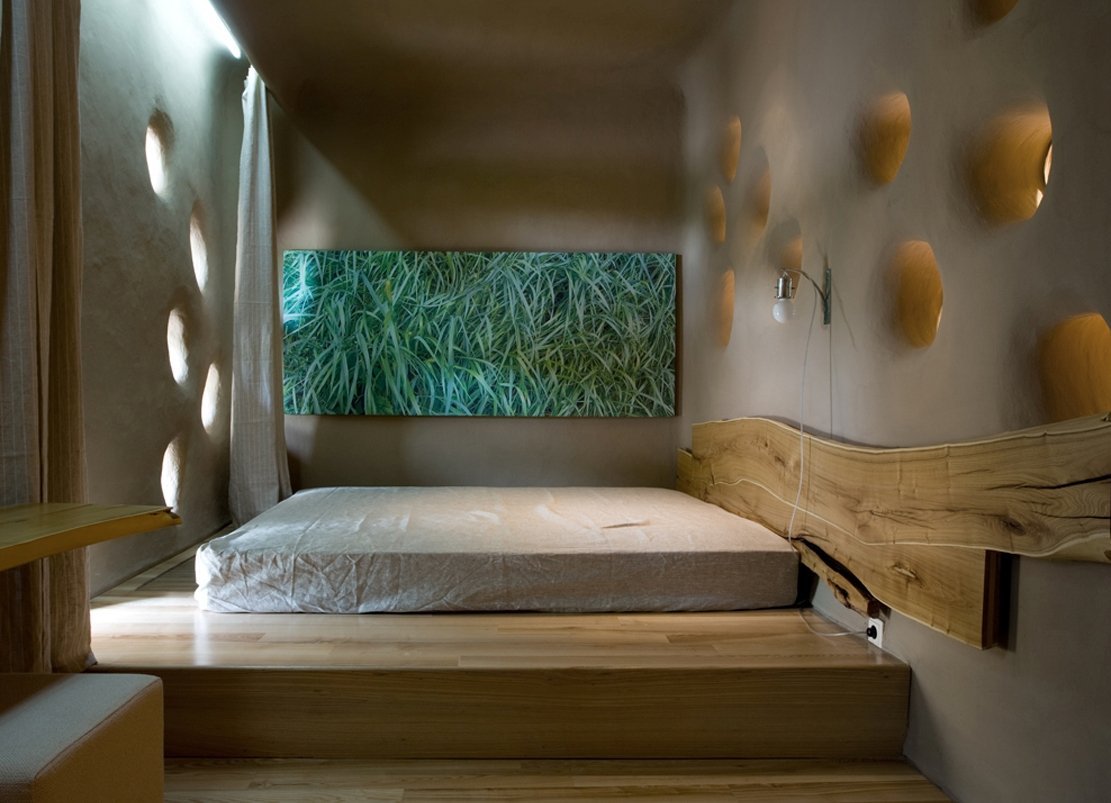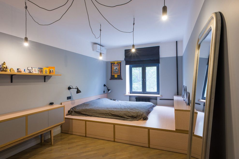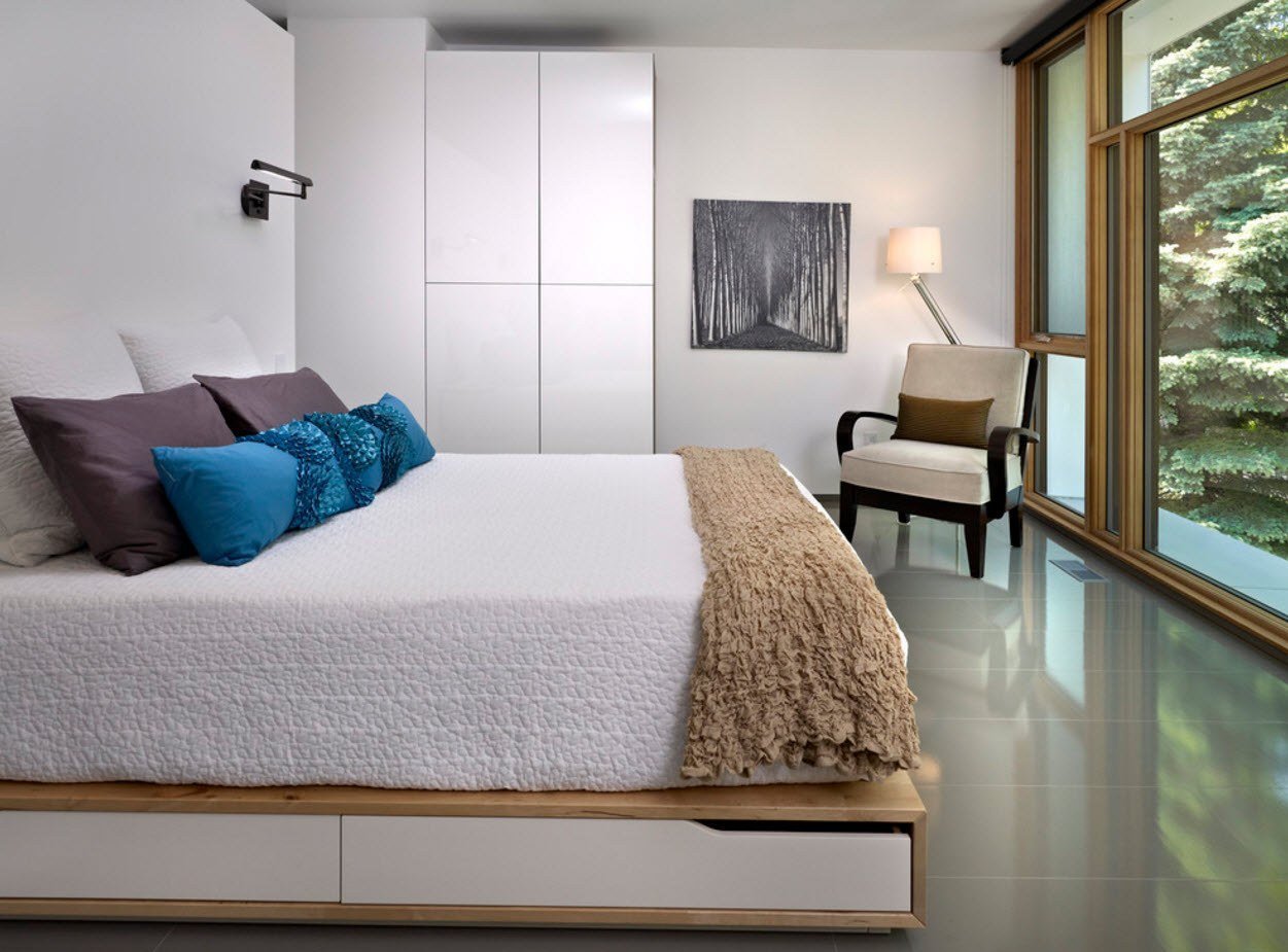 Una habitación larga y estrecha, un pequeño podio redondo se dividirá bellamente por la mitad. Otra opción es establecer la elevación justo al lado del muro estrecho, pero no cerca de la ventana. La habitación se volverá mucho más cómoda.Para habitaciones cuadradas, son adecuados los podios estrechos y altos, dentro de los cuales hay espacios de almacenamiento. La cama empotrada también será cómoda, ya que no tiene que hacerse con cuidado todas las mañanas y antes de que lleguen los invitados.