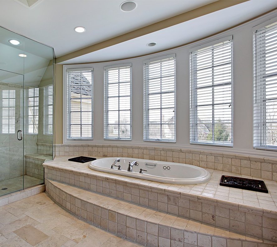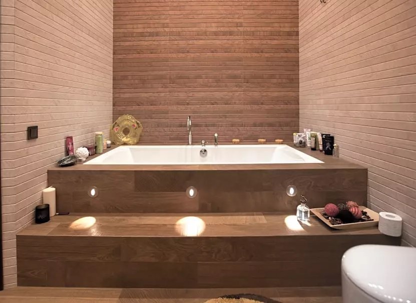 Un diseño clásico es una bañera integrada en el podio con escalones. Se ve hermoso y solemne, pero requiere medidas de seguridad. El revestimiento antideslizante lo ayudará a sentirse más seguro. El podio técnico en el baño está diseñado para ocultar las tuberías. Para tener acceso a los nodos de comunicación clave, el podio está equipado con puertas. En casas particulares, los elevadores pueden no estar ubicados en el baño, sino en otras habitaciones. El baño en sí a menudo se instala en el centro, lo que crea dificultades con el drenaje. Elevar el baño al podio ayuda a eliminar este problema y garantizar un drenaje adecuado del agua. Para subir al podio en paralelo con su función técnica, además de zonificar el espacio, use mosaicos de diferentes colores. Las paredes y los pisos están terminados en colores claros, y el podio se presenta con azulejos más oscuros. La iluminación multinivel hará que el interior sea más rico y cómodo, atraerá aún más la atención sobre un tema tan original.