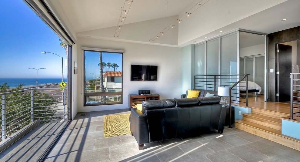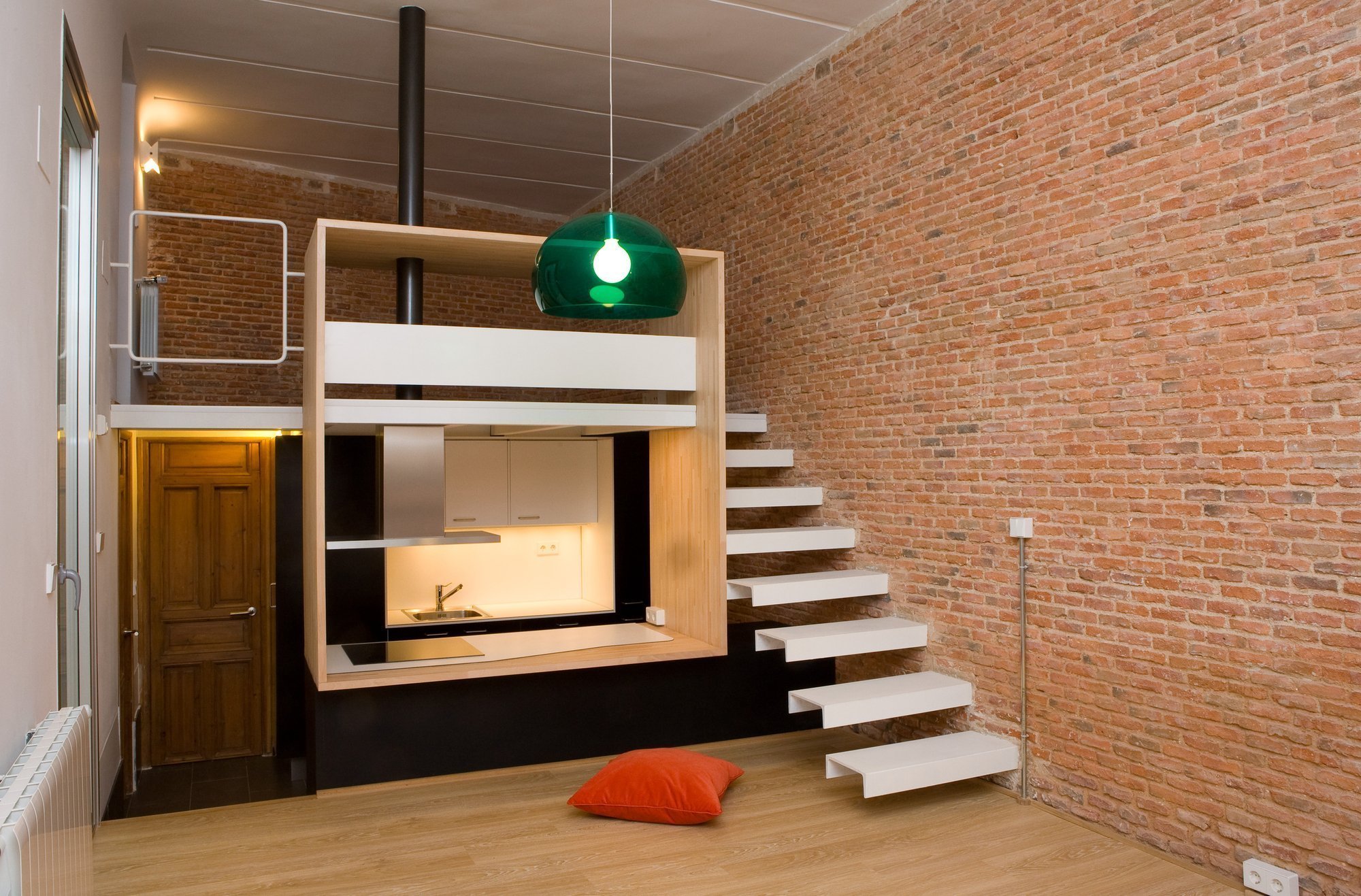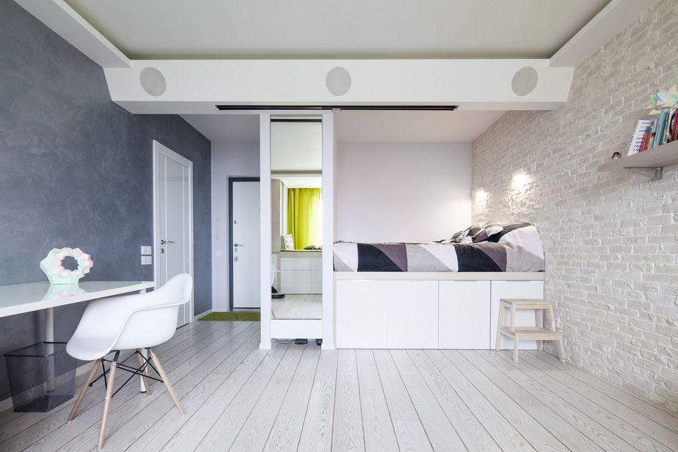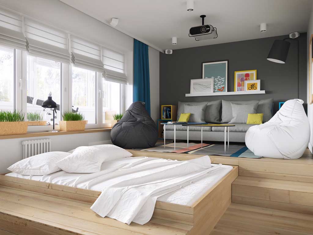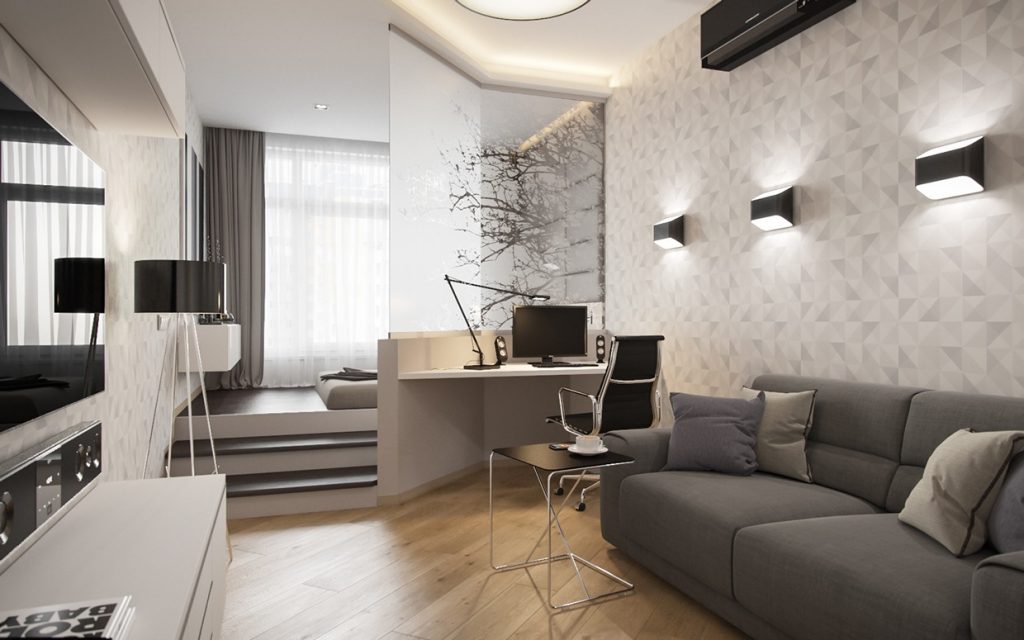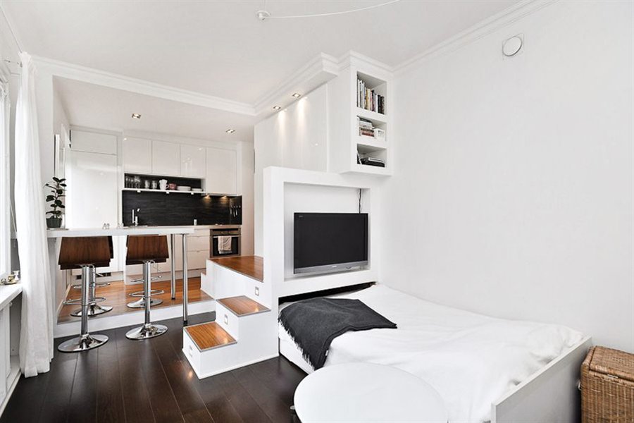 En los apartamentos tipo estudio, los diseñadores suelen utilizar podios multifuncionales, que al mismo tiempo sirven tanto para almacenar cosas como para enmascarar cables y zonificación. Con la ayuda de podios, el área para dormir se separa del área de trabajo o comedor. La zona de la cocina se ve originalmente en una elevación baja. Superficies lisas y colores lisos brillantes son bienvenidos. Mantuvo el estilo tecno o minimalismo. Si el área del estudio es pequeña, un área de trabajo con una mesa y estantes para libros se eleva a un podio alto. Se coloca una cama extraíble en el nicho del podio. Dado que el podio saldrá alto, deberás equipar las escaleras. Los cajones se colocan en sus escalones, donde se pueden guardar la ropa de cama, así como CD, documentos y un botiquín de primeros auxilios. Si hay suficiente espacio, se organizan 2-3 podios, lo que le permite resaltar conveniente y bellamente todas las áreas funcionales.