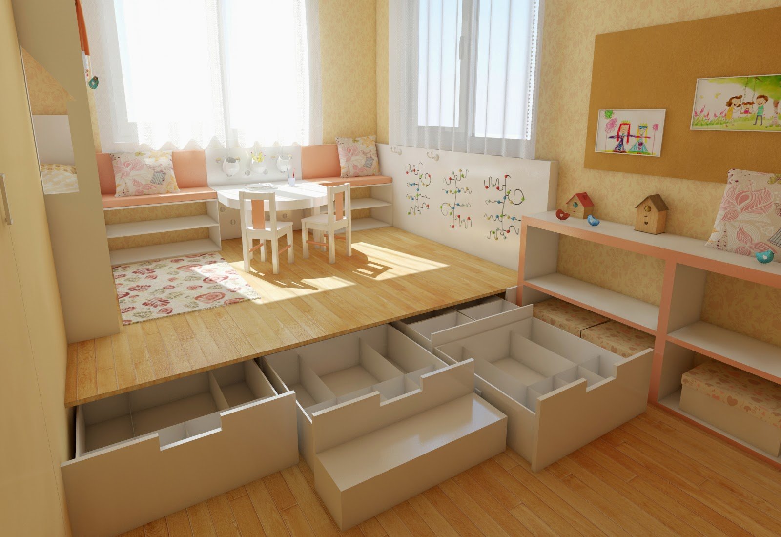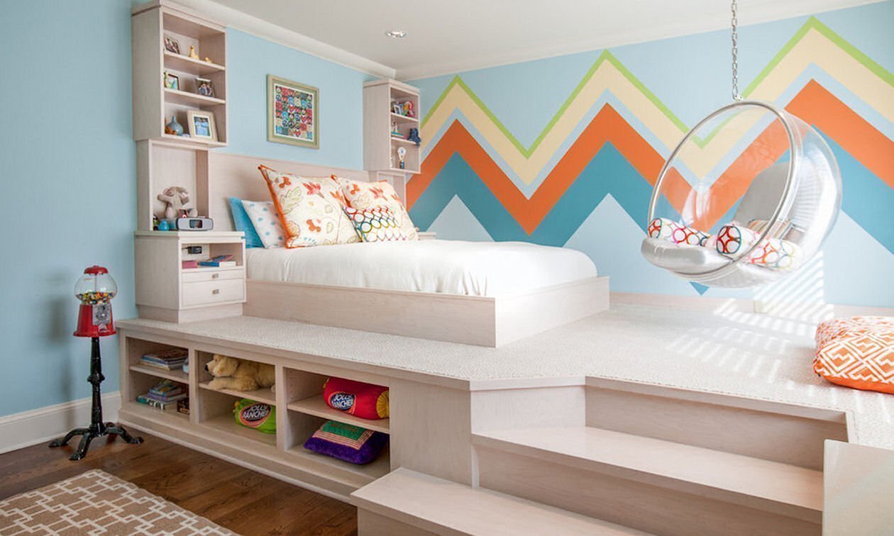El diseño de la habitación para niños se crea teniendo en cuenta las necesidades de su edad. Se presta la mayor atención a los problemas de seguridad. Es deseable que cada elemento del interior contribuya al desarrollo de los niños, y que la atmósfera en su conjunto sea lo más cómoda posible. Para los gemelos, se establece un podio, en la parte superior de los cuales hay lugares para estudiar, y en el interior hay dos cunas. En un podio bajo puedes organizar un rincón del juego. Los cajones "escondidos" en el interior se convertirán en un lugar para juguetes. Para los niños mayores, el podio puede servir como una gran mesa con estanterías. Una decisión de diseño interesante para un niño mayor de 5 años es un podio alto de literas. En el primer nivel hay un vestidor con ropa, y en la parte superior hay una cama con costados. Con este diseño de la habitación infantil hay mucho espacio libre para juegos al aire libre.
