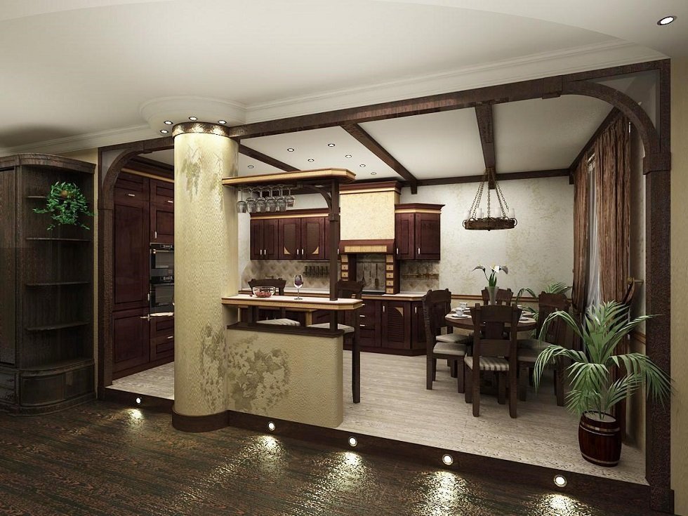 ¿Vale la pena usar un podio en la cocina-comedor? Depende de su diseño. Gran espacio necesita ser dividido en zonas. Una barra de bar con un par de sillas está instalada en el podio.Dada la gran carga, es aconsejable elegir un podio monolítico para la cocina (y el baño). En una habitación de tamaño mediano, el área del comedor es elevada, separándola del área de trabajo.