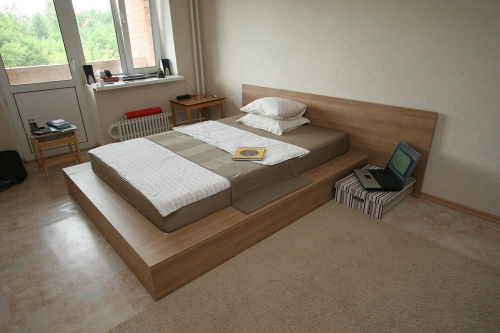 Un ejemplo clásico de funcionalidad es la cama del podio. Utilizándolo en un pequeño Jruschov, obtienen al mismo tiempo un armario espacioso, un escritorio de trabajo conveniente y una litera espaciosa. Una parte importante del apartamento permanece libre, el efecto del desorden y el desorden desaparece. El uso de la plataforma como almacenamiento de artículos para el hogar es un aumento notable en el área utilizable. Otra opción es colocar la zona interior principal en una elevación, por ejemplo, instalar un televisor con altavoces en la parte superior. El espacio interior está perfectamente lleno de artículos para el hogar, los cables se colocan en el mismo lugar.