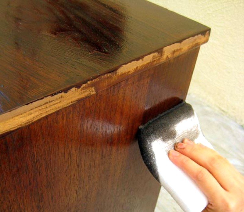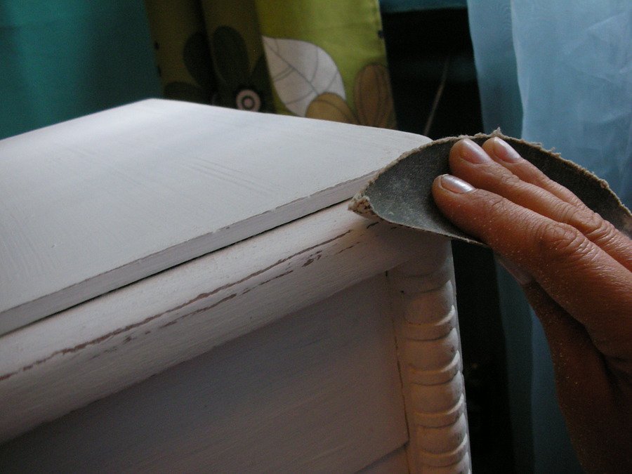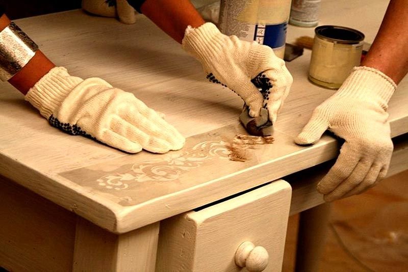 Es más fácil trabajar con madera natural; todos los tipos de limpieza, pintura, barniz para muebles son adecuados. A menudo se forman grietas y astillas en el árbol, que deben procesarse cuidadosamente. Los defectos se lijan para que no haya rebabas, imprimación, masilla. Después de aplicar la tierra, la pila se eleva sobre el árbol, que se lija con la piel R-320. La superficie se limpia con un paño humedecido con disolvente, imprimado, pintado o barnizado. Los muebles bien conservados se pueden pintar con barnices de tinte, manchas. Armarios antiguos y mesitas de noche están cubiertos con esmaltes opacos. Los artículos pequeños están convenientemente pintados con aerosoles a base de acrílico.Los esmaltes de nitro de secado rápido le dan un brillo hermoso, pero son tóxicos, no son adecuados para trabajar en un departamento.