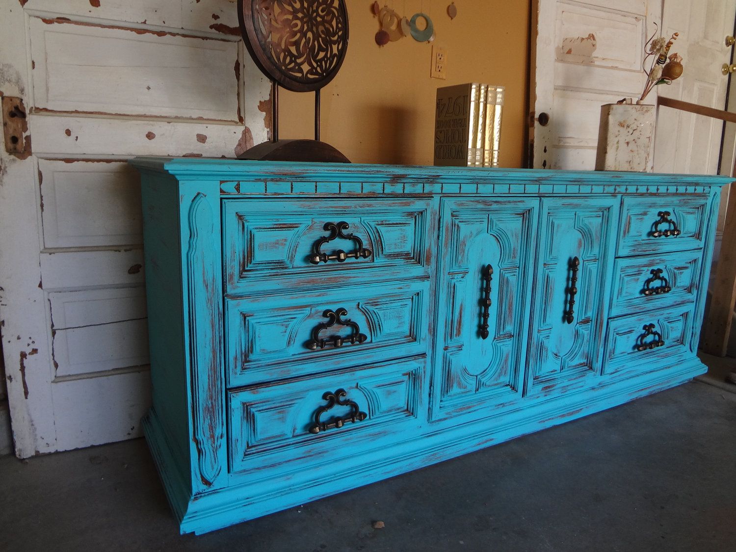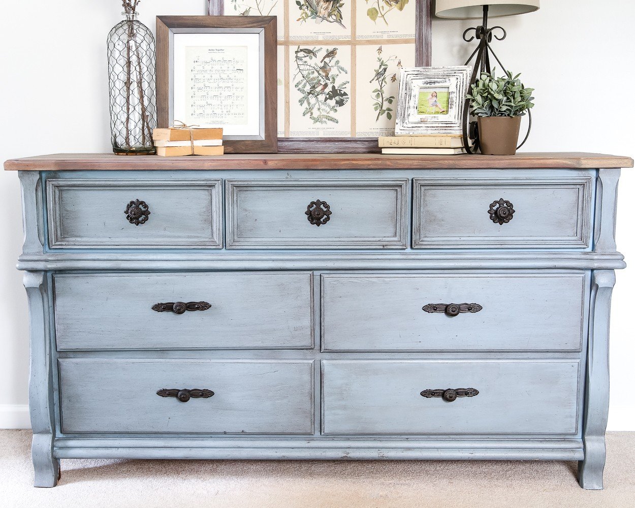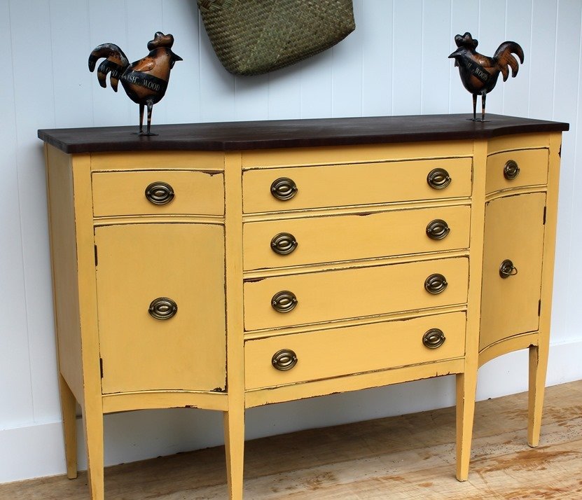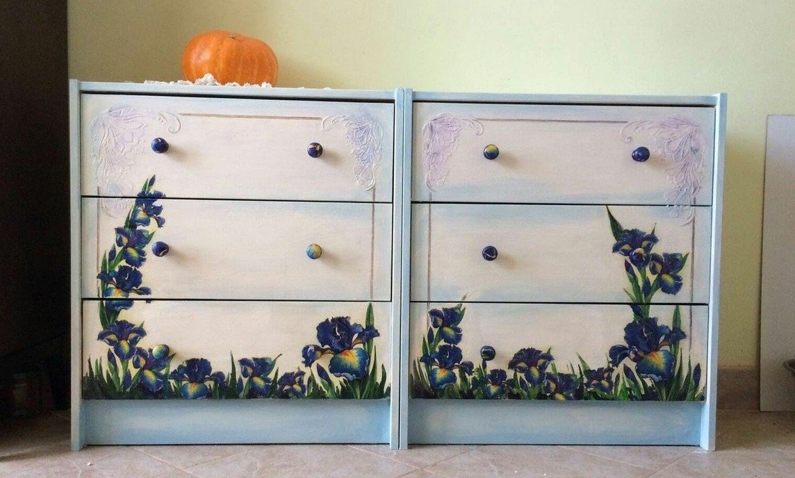 Para crear un buffet o una cómoda en el estilo provenzal, los lugares individuales en la fachada, las esquinas y la decoración se pintan con esmalte marrón o azul, después del secado se enceran. Toda la superficie está pintada 2-3 veces con esmalte blanco. Los fragmentos encerados se limpian con un cuchillo o espátula.