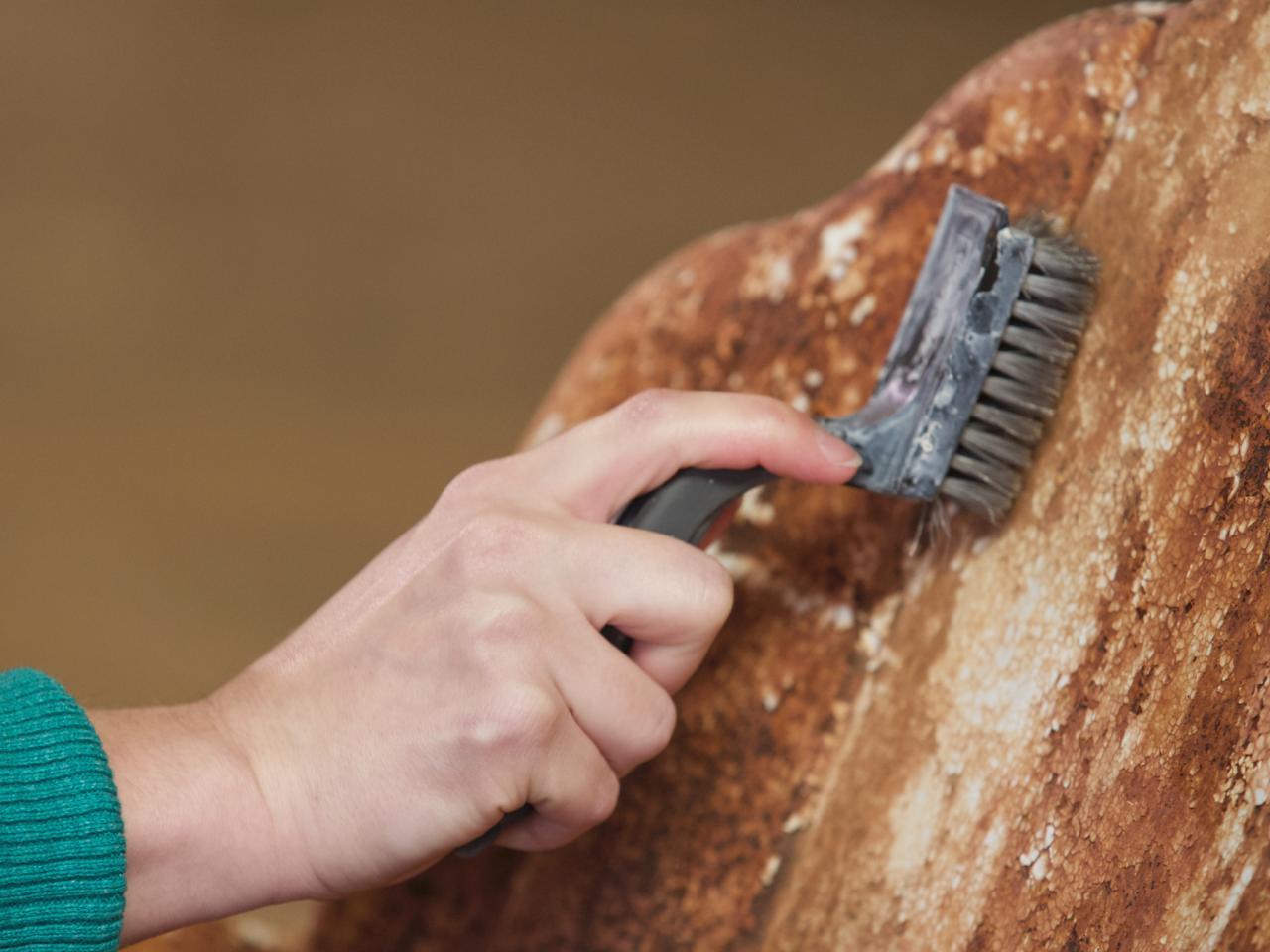 Es conveniente eliminar el barniz de las partes talladas con una toallita de alambre. Se recomienda tratar la superficie de roble con una esponja de nylon.