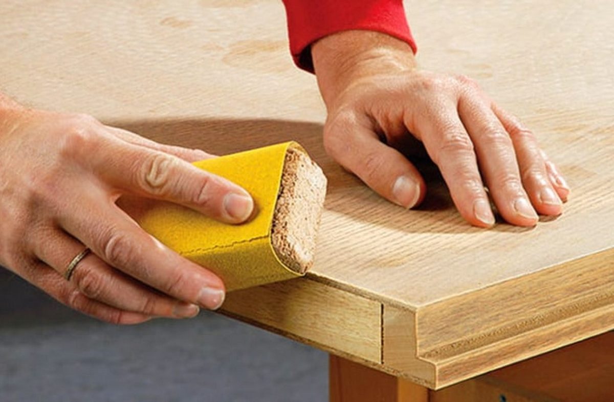La opción de tratamiento más asequible es el lijado. Una lijadora acelera el proceso, pero sin experiencia, puede tocar una capa de chapa. El barniz se elimina con un raspador de metal, cepillo, papel de lija grueso. Para suavizar la superficie, se realizan movimientos a lo largo de las fibras. Para el procesamiento primario, se necesita papel con un tamaño de grano de P40, 60, la molienda final se lleva a cabo con el grano P150, 180. Las irregularidades menores se eliminan con el abrasivo P120.Para garantizar un contacto uniforme del papel con la superficie tratada, use almohadillas de lijado con abrazaderas. Se pueden reemplazar con un pequeño bloque de madera de poliestireno en el que el papel de lija se une con pernos. La superficie está pulida a perfecto estado, limpia de polvo.