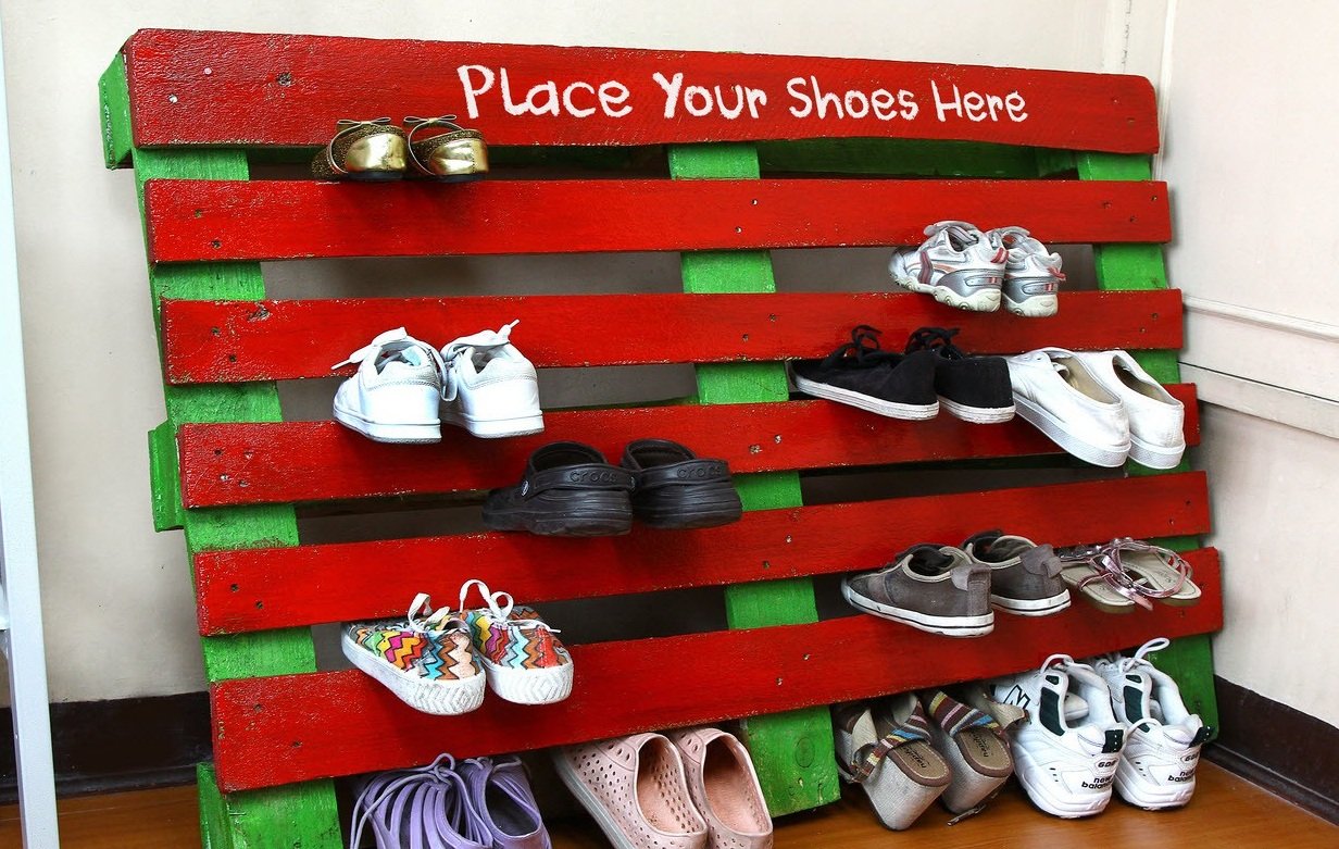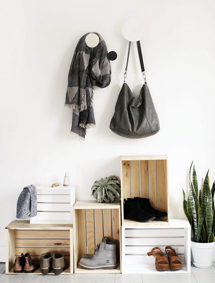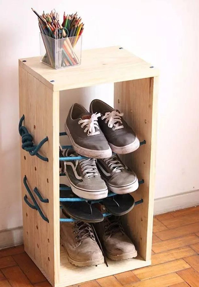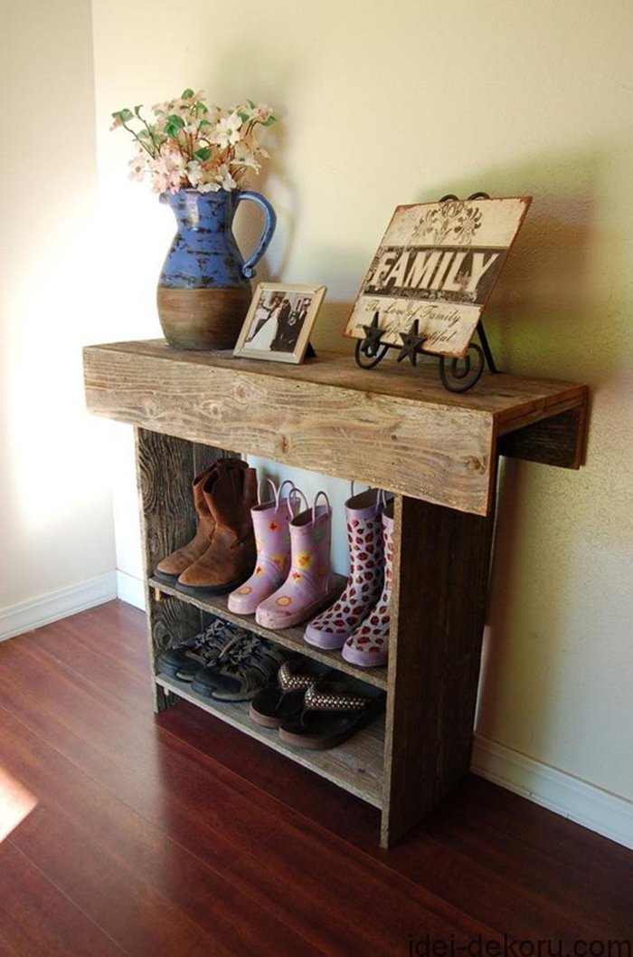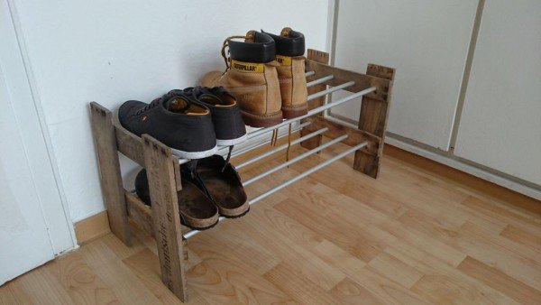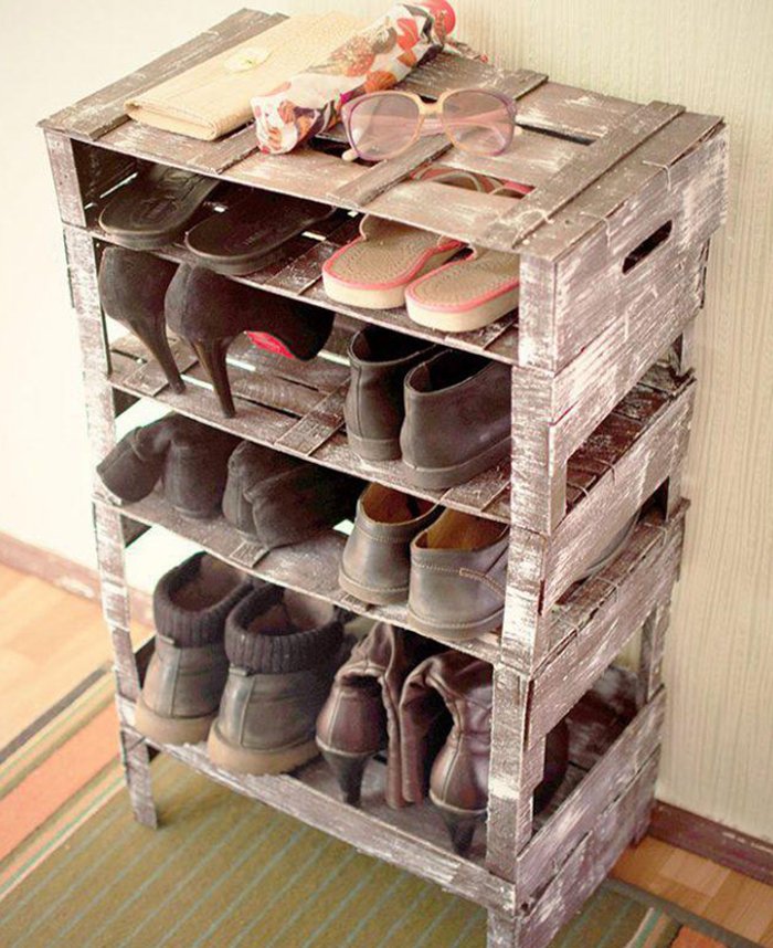 Los estantes de paletas y cajas se consideran, quizás, los más concisos y simples de fabricar.La construcción se puede construir en solo unas pocas horas. La paleta de construcción se lija a fondo con papel de lija o una máquina de lijado. Luego se cubre con una composición especial repelente al agua. Después de eso, la paleta se coloca en posición vertical y simplemente se apoya contra la pared. Zapatos puestos entre las tablas transversales. Para hacer un estante clásico, la paleta se corta en varias partes, que están conectadas entre sí a la manera de lo que sea, separadas por barras. La estructura de las cajas se ensambla con pegamento. El material también se lija previamente y se recubre con un compuesto protector especial. Después de ensamblar la estructura, se puede recubrir con pintura. También hay una opción montada en la pared para los "perezosos". Las cajas se pintan en diferentes colores, por principio de analogía o contraste, y se atornillan a la pared, dejando espacios entre los módulos. La composición ocupa exactamente tanto espacio como el maestro lo ocupa. Algunas cajas se pueden "romper" dentro usando estantes. En el futuro, se usarán para zapatos "bajos" (botas, zapatos). Otros están decorados con tabiques verticales. Esta opción es adecuada para el almacenamiento compacto de zapatos de verano (pizarras, chanclas, zapatillas). Las cajas que permanecieron intactas se usan para colocar botas altas. Esta forma de organización se ve brillante, divertida y un poco desordenada, por eso se adapta exclusivamente a estilos ligeros: fusión, eclecticismo, etnia, un grupo de tendencias de la aldea.