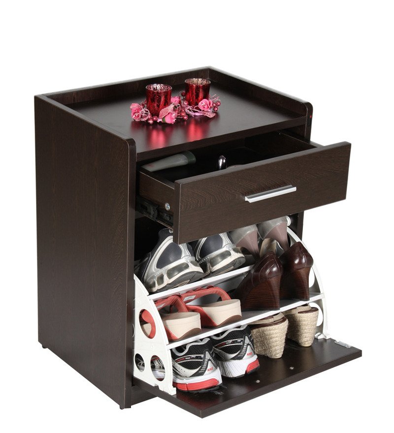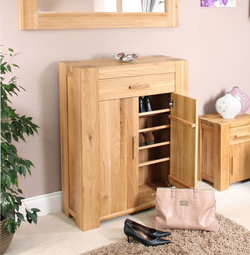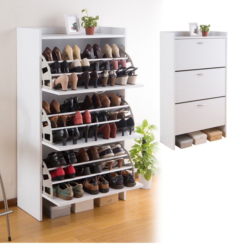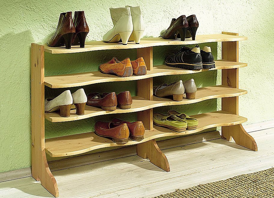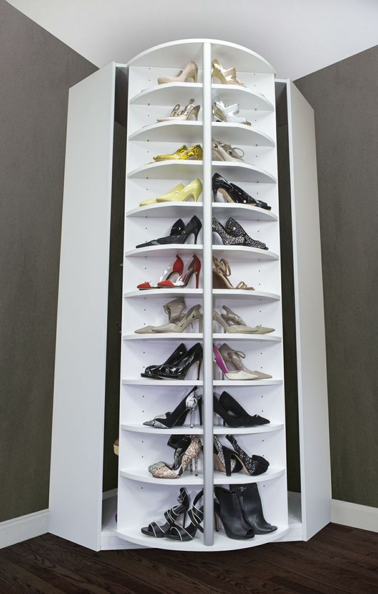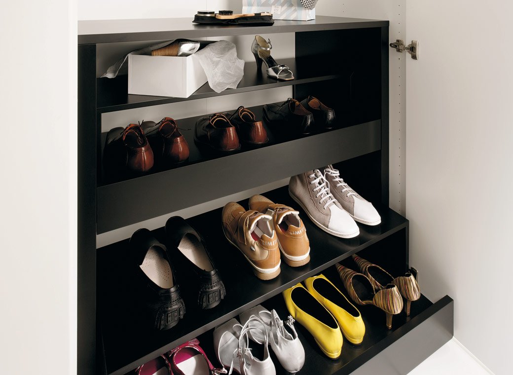 Estantes y armarios de tipo cerrado o modelos delgados. Las cajas horizontales convencionales se consideran poco prácticas, por lo tanto, en los modelos modernos, se utilizan cada vez más mecanismos especiales delgados que giran con la puerta y llevan los estantes a la posición "inclinada". Cuando está cerrado, los zapatos se mantienen en posición vertical.